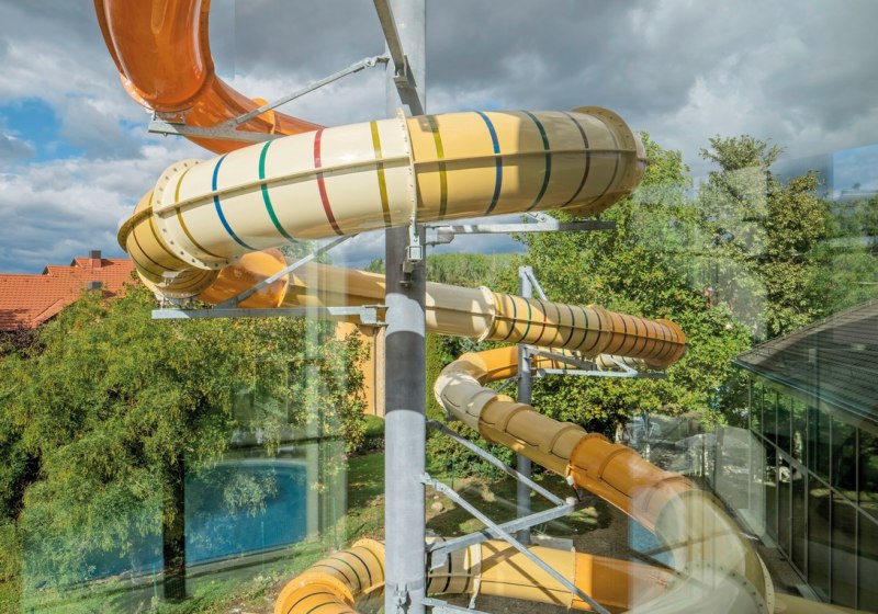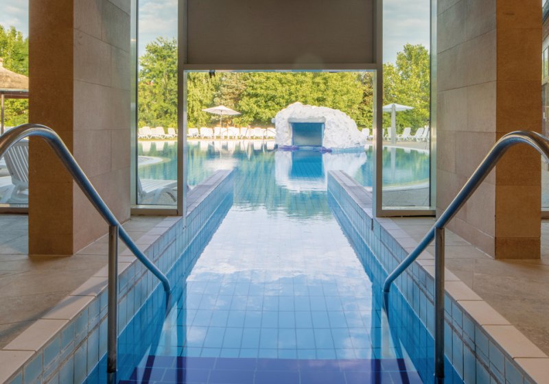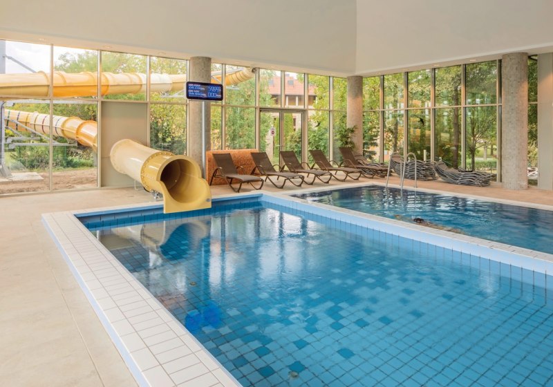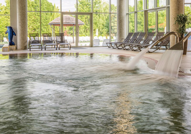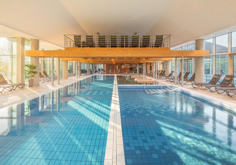 Im 3.500 Quadratmeter großen Spa erwartet Euch ein Hallenbad mit Erlebnisbecken, zwei Thermalbecken und ein 20-Meter-Sportbecken. Dazu kommen Kinderbecken und beheizbarer Pool. Salzraum mit Verdampfer, Salz-Sandkasten und Erlebnisduschen ergänzen die Wasserlandschaft. Highlight: Thermal- und Sportbecken in sinnvoller Kombination.