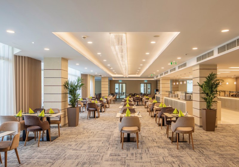 Ihr bewegt Euch in einer Anlage mit Buffetrestaurant, Café und mehreren Bars, darunter Lobby- und Poolbar. Für Familien stehen Spielplatz und Spielzimmer bereit, für Seminare Konferenz- und Bankettsaal. WLAN ist in der gesamten Anlage verfügbar, ein Souvenirshop und Friseur ergänzen das Angebot. Highlight: Familienfreundlich und tagungstauglich, vielseitige Bereiche ohne Hektik.