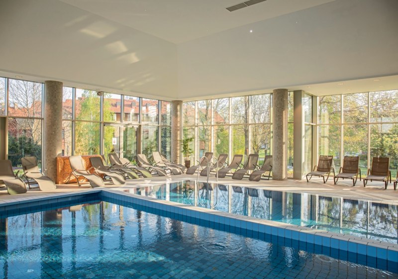 - Pools & Liegen: Innen- und Außenpools mit Liegewiese und Sonnenterrasse.