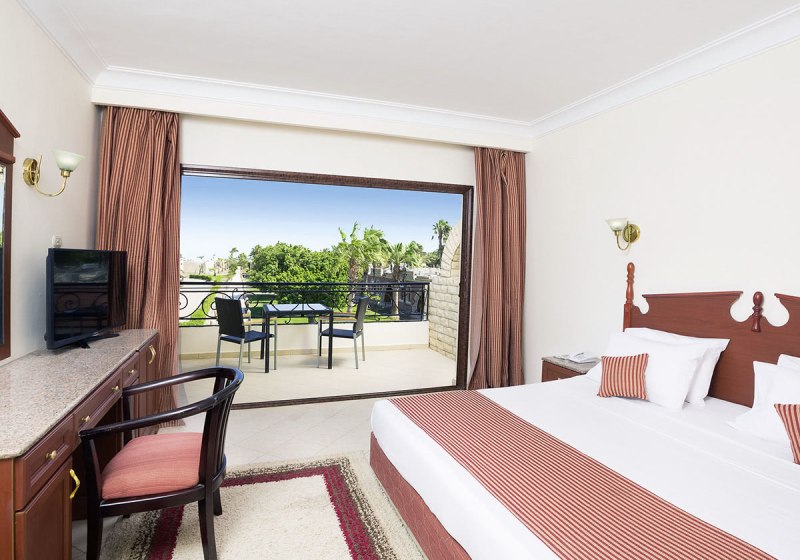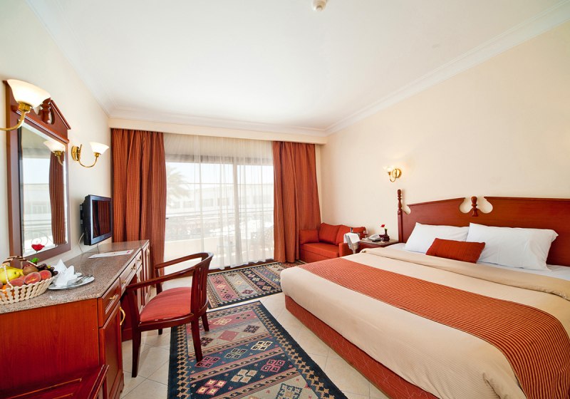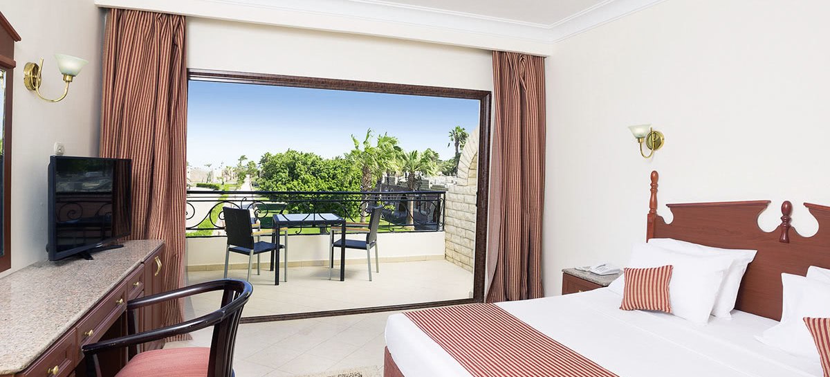 Ihr wohnt in zweistöckigen Gebäuden und Bungalows. Zimmer bieten etwa 35–36 Quadratmeter, Suiten rund 40–45 Quadratmeter. Zur Ausstattung zählen Dusche/WC, Klimaanlage, Sat-TV, Telefon, WLAN, Minikühlschrank/Minibar sowie Balkon oder Terrasse, teils mit Gartenblick. In höheren Kategorien steht ein Safe bereit.