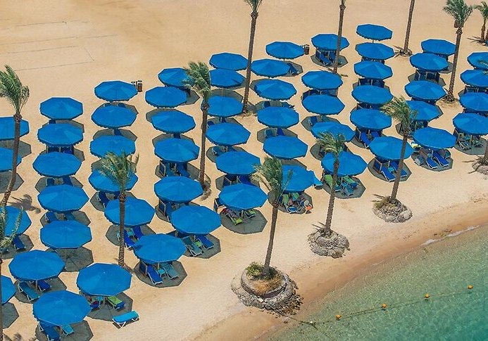• Strandsetup: Liegen, Schirme und Badetücher stehen direkt am Meer bereit.