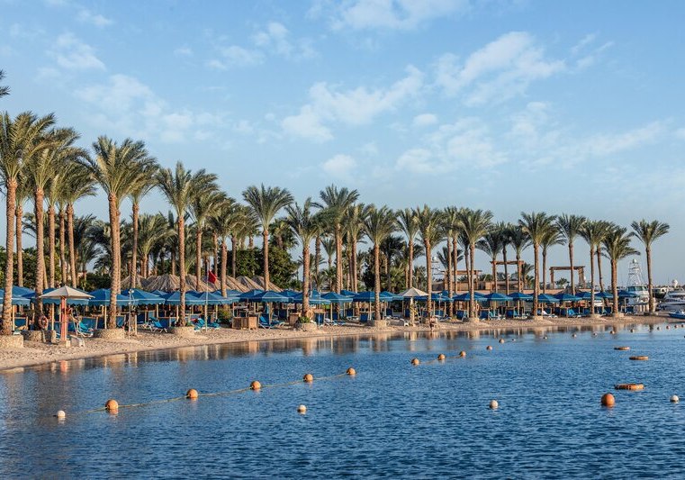 Im Continental Hotel Hurghada wohnt Ihr direkt am Roten Meer – mit Blick auf eine flach abfallende Badebucht, feinen Sand unter den Füssen und einen kleinen Hafen als stimmigen Rahmen. Die Anlage wirkt freundlich und übersichtlich, mit weiten Wegen zwischen Palmen, einem grossen Süßwasserpool und Rückzugsorten nahe am Wasser. Familien finden Raum und Struktur, Strandurlauber klare Perspektiven auf Sonne und Meer. Wer Abwechslung sucht, wechselt zwischen Pool, Strand und den lebhaften Gemeinschaftsbereichen mit Café-Charakter.