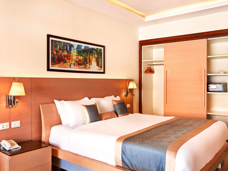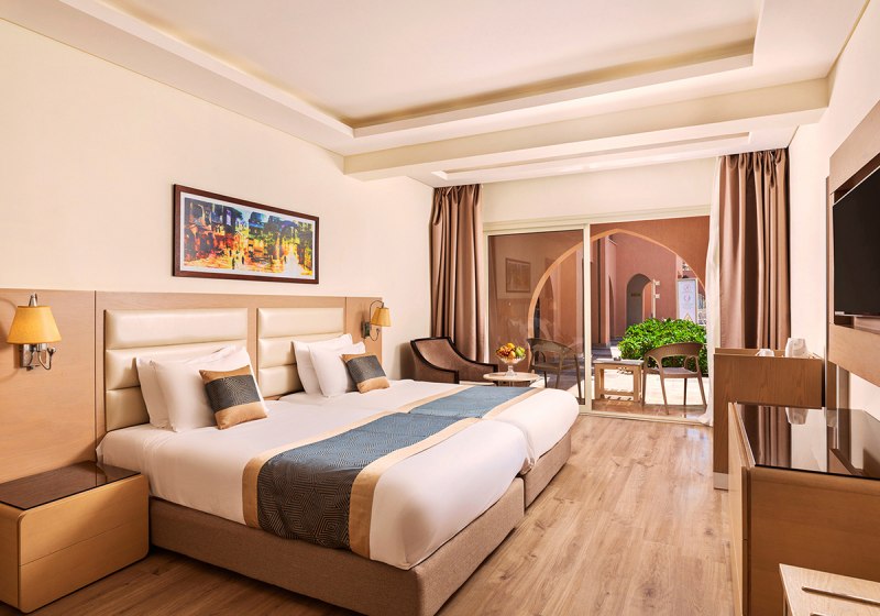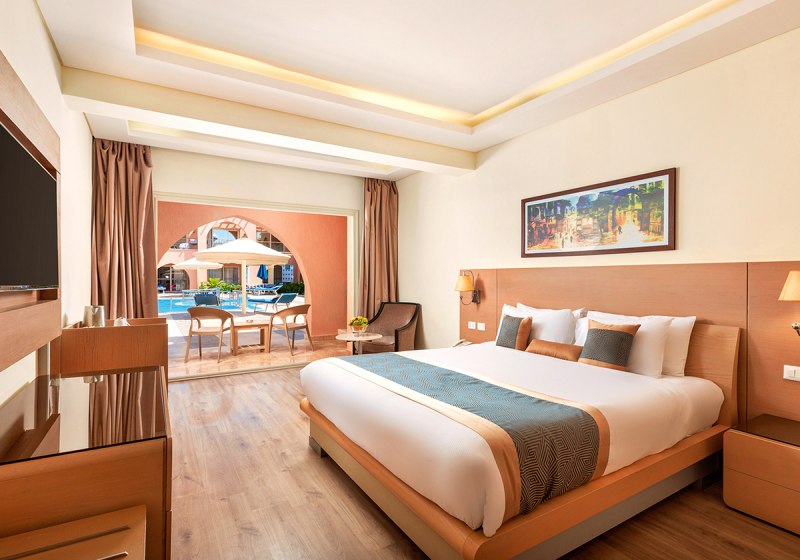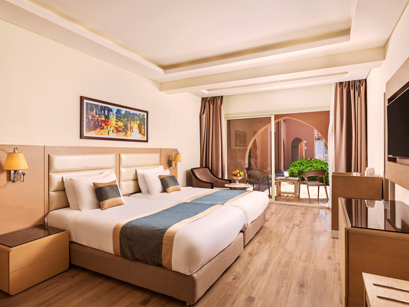 Ihr wohnt in Zimmern mit Balkon oder Terrasse, wahlweise mit Garten- oder Poolblick. Klimaanlage und Minibar bzw. Minikühlschrank sorgen für konstante Erfrischung, der Safe schützt Wertsachen. Zur Grundausstattung zählen TV, Telefon, WiFi und Schreibtisch; Fliesen- oder Parkettboden unterstreicht die klare, pflegeleichte Anmutung.