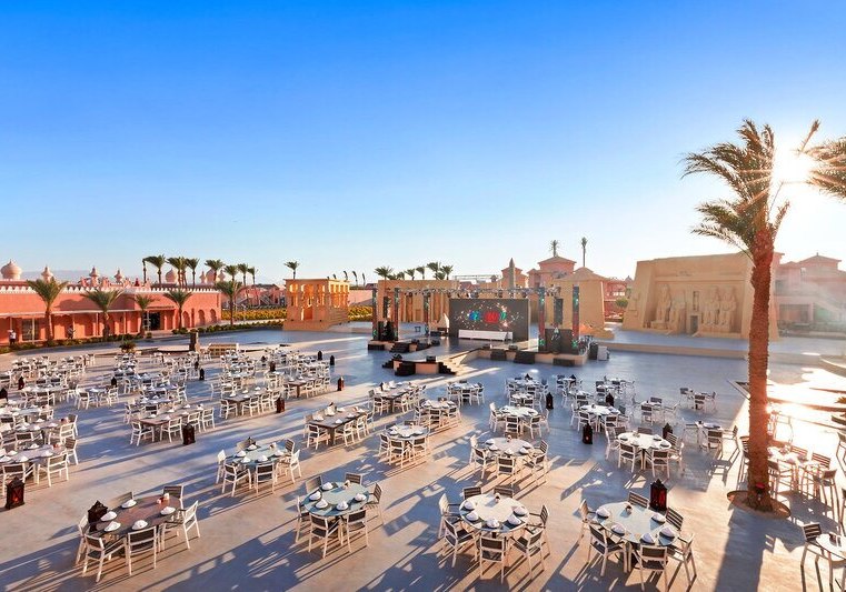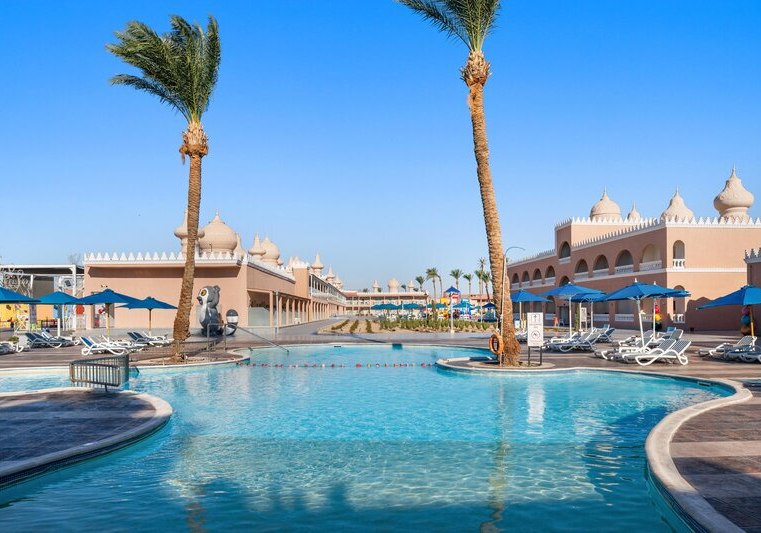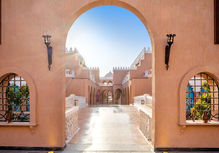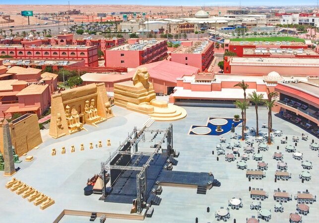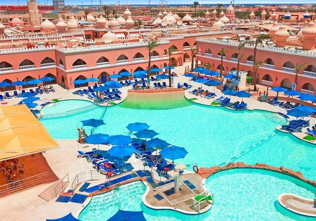 Das Pickalbatros Alf Leila Wa Leila Resort empfängt Euch als weitläufige Anlage im Stil eines orientalischen Dorfes. Zwischen Gassen, Plätzen und Wasserflächen bewegt Ihr Euch durch ein Resort, das mit sieben Pools, Sonnenterrassen und lebendigen Treffpunkten strukturiert ist. Die Atmosphäre wirkt unkompliziert, mit klaren Wegen zu Restaurants, Bars und Freizeitbereichen. Familien schätzen die Kinderpools mit Wasserrutschen, Aktivurlauber den Sportmix, Ruhesuchende die stilleren Ecken an den Becken und Terrassen.
