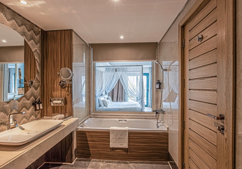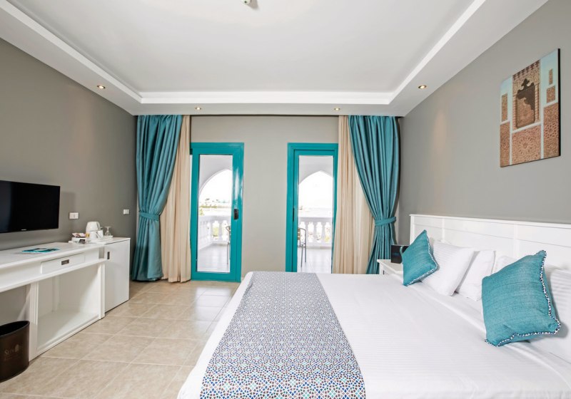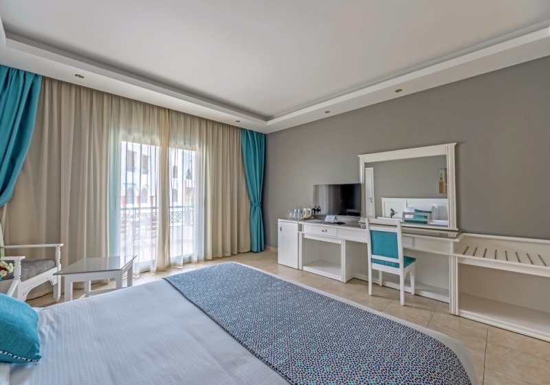 Ihr wohnt in geräumigen Doppelzimmern ab etwa 45 Quadratmetern mit Balkon oder Terrasse, Klimaanlage, Safe, Minibar, TV und Kaffee-/Teezubereiter. Deluxe-Varianten bieten Garten- oder Poolblick. Direkt am Meer liegen Beach-Front-Zimmer in erster Reihe mit Meerblick.