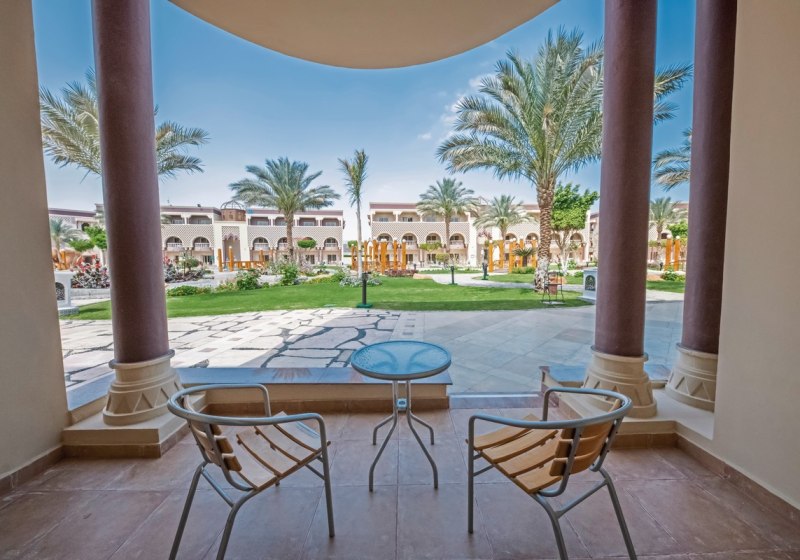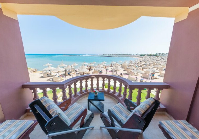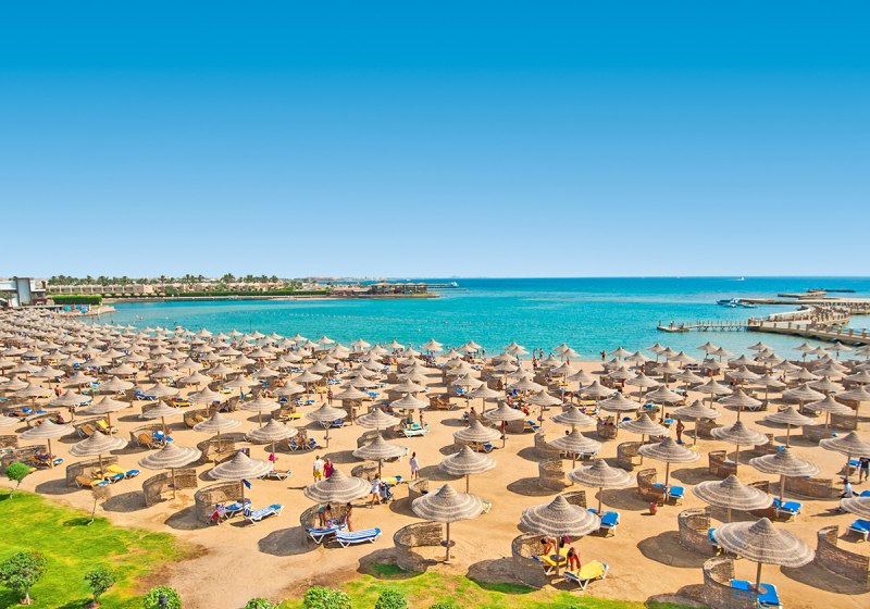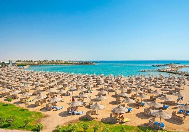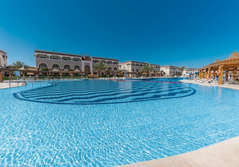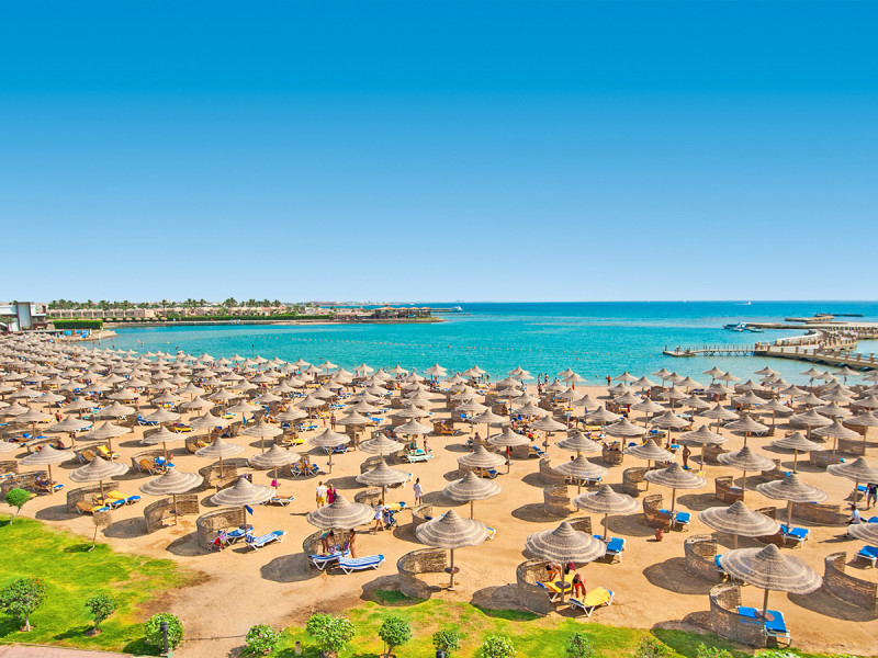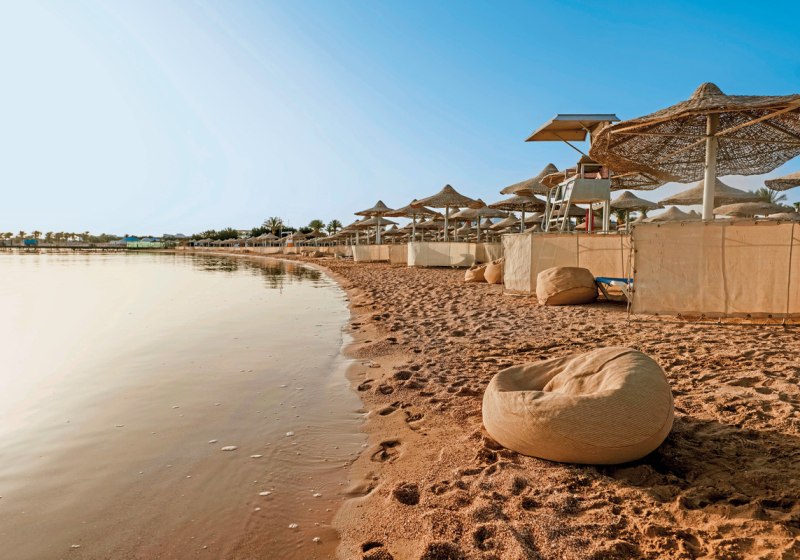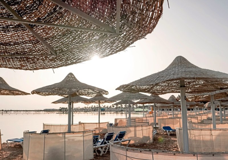 Ihr residiert in Hurghada direkt am 400 Meter langen, flach abfallenden Sandstrand. Bis zum internationalen Flughafen sind es etwa 15 Kilometer, das Stadtzentrum erreicht Ihr nach rund 20 Kilometern. Die Meereslinie liegt unmittelbar vor der Anlage, Sonnenschirme und Liegen stehen am Strand ebenso bereit wie am Pool.