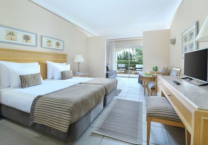 Die Doppelzimmer bieten auf rund 32 m² klare Ausstattung: Dusche/WC, Föhn, Klimaanlage, Safe, Telefon, Sat-TV, Kühlschrank sowie Balkon oder Terrasse. Ergänzend stehen Minibar, Wasserkocher, Kaffee-/Teezubereiter und teils Espressomaschine bereit. Verdunkelung, Bademäntel, Pflege-Extras und ein Gute-Nacht-Service zwischen 18:00 und 19:00 Uhr runden den Komfort ab.