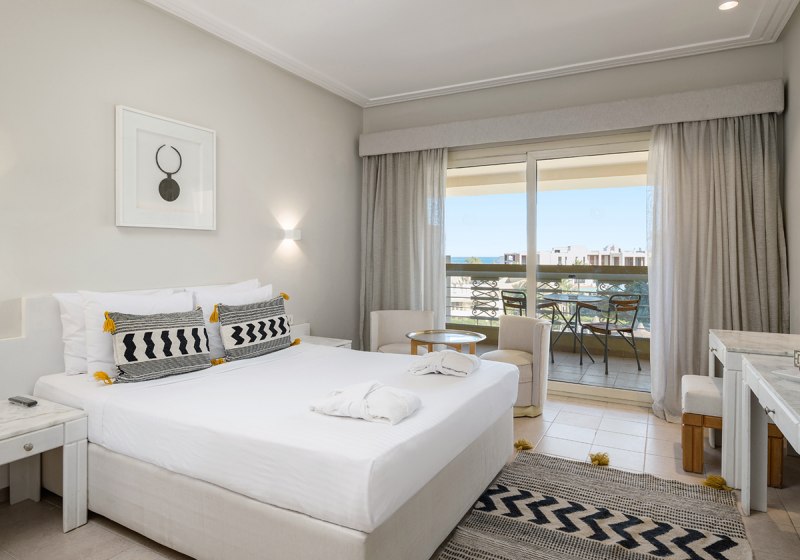Die Doppelzimmer messen etwa 27 m² und sind mit Dusche, Föhn, Klimaanlage, Telefon, TV und Minibar ausgestattet. Je nach Kategorie blickt Ihr auf Garten, Pool, Meer oder Aquapark; manche Zimmer verfügen über Balkon, andere über Fenster ohne Balkon oder Terrasse. In Deluxe liegen Bademantel und Slipper bereit.