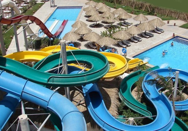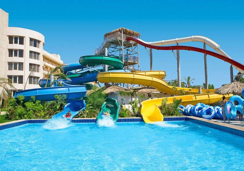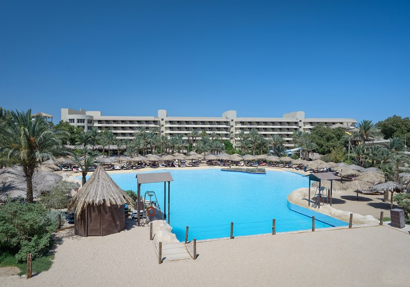 Das Resort umfasst 733 Zimmer in sechs Etagen, bedient von sechs Liften. Rezeption und Lobby sind zentral organisiert, WLAN steht in Lobby und am Pool bereit. Mehrere Außenpools, Kinderpools sowie der Aquapark mit Wellenbad strukturieren das Gelände, an Pool und Strand warten Liegen, Auflagen, Schirme und Badetücher.