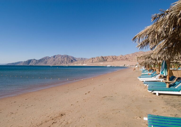 Ihr wohnt in Dahab, Ägypten, mit nur etwa 50 Metern bis zum privaten Sandstrand. Diese Nähe prägt Euren Tagesrhythmus: kurze Wege vom Frühstück an den Strand, später zur Poolbar oder auf die Sonnenterrasse. Liegen und Schirme stehen am Strand ebenso wie am Pool kostenfrei für Euch bereit.