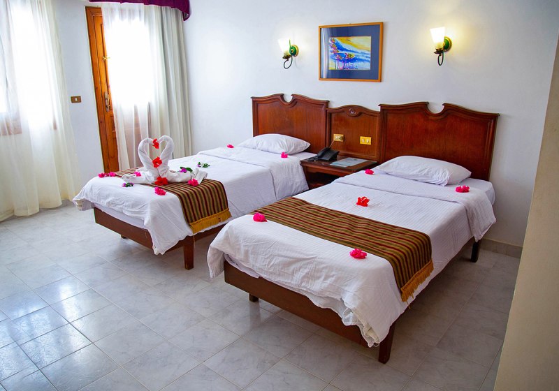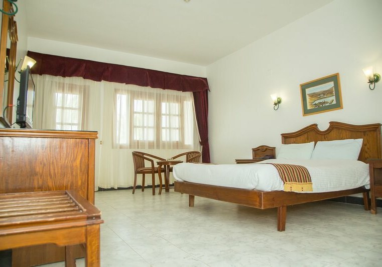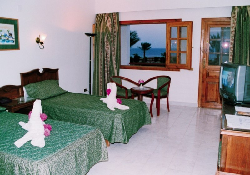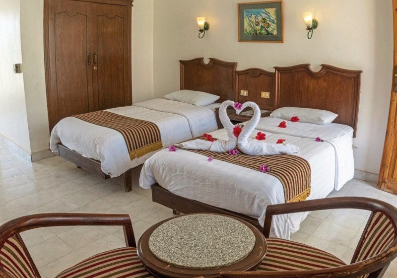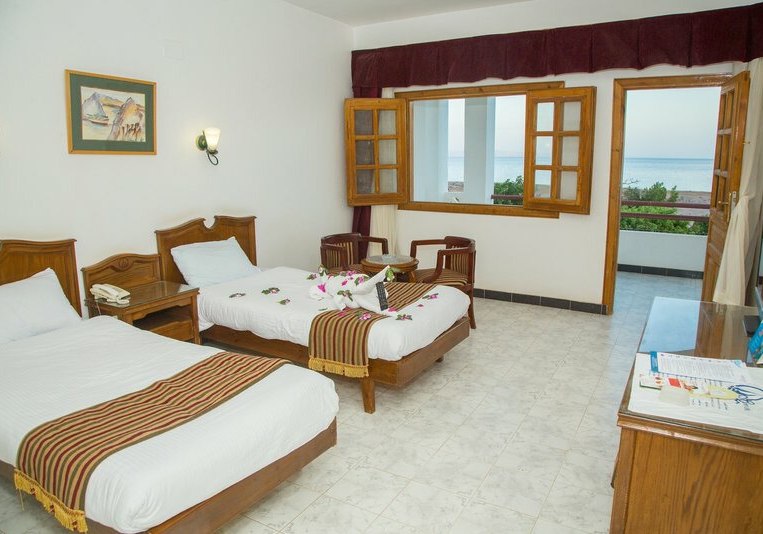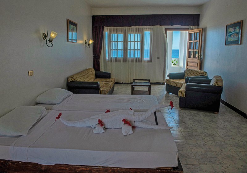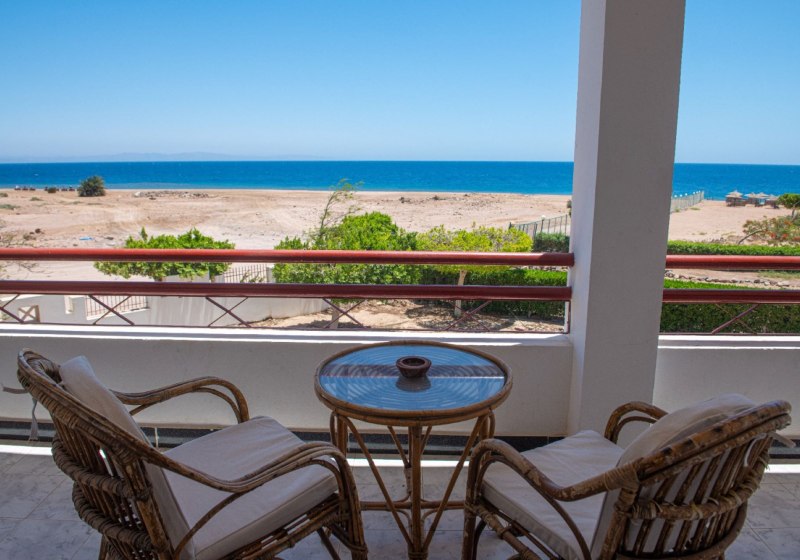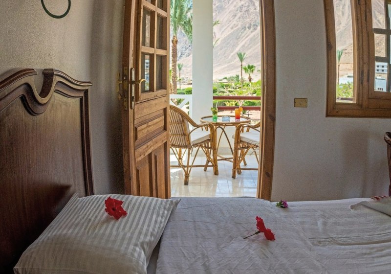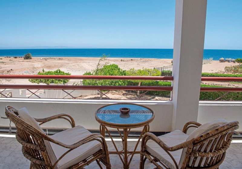 Je nach Lage öffnet sich der Blick zu Garten, Pool, Bergen oder zum Meer. Fliesenboden sorgt für robuste Pflegeleichtigkeit, Kinderbetten stehen bereit. Einige Zimmer punkten mit direktem Terrassenzugang, andere mit erhöhtem Ausblick vom Balkon. Die einstöckige Anlage begünstigt kurze Wege und ein ruhiges Wohngefühl. Wer mehr Bewegungsraum braucht, findet im Familienzimmer das passende Layout. Highlight: Ausblicke variieren von grünem Garten bis zur Weite des Roten Meeres.