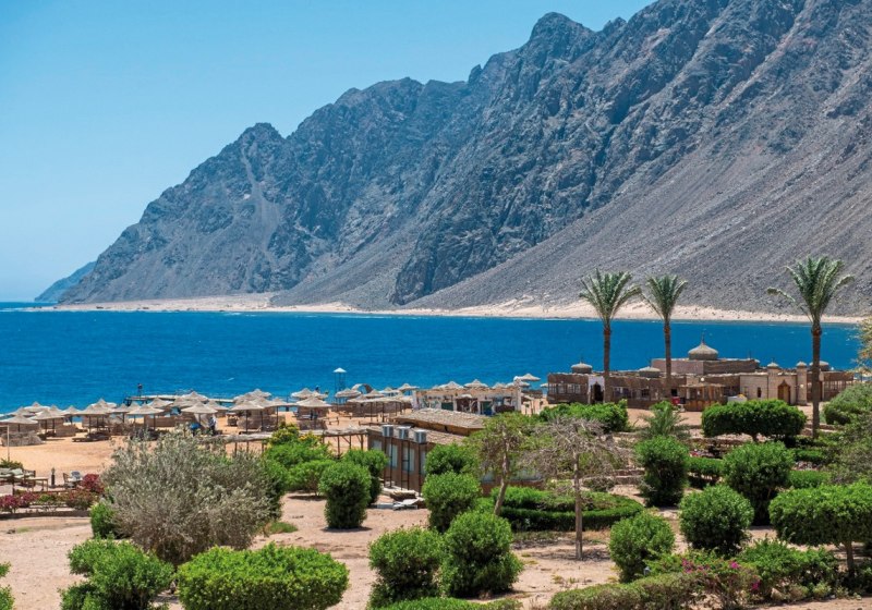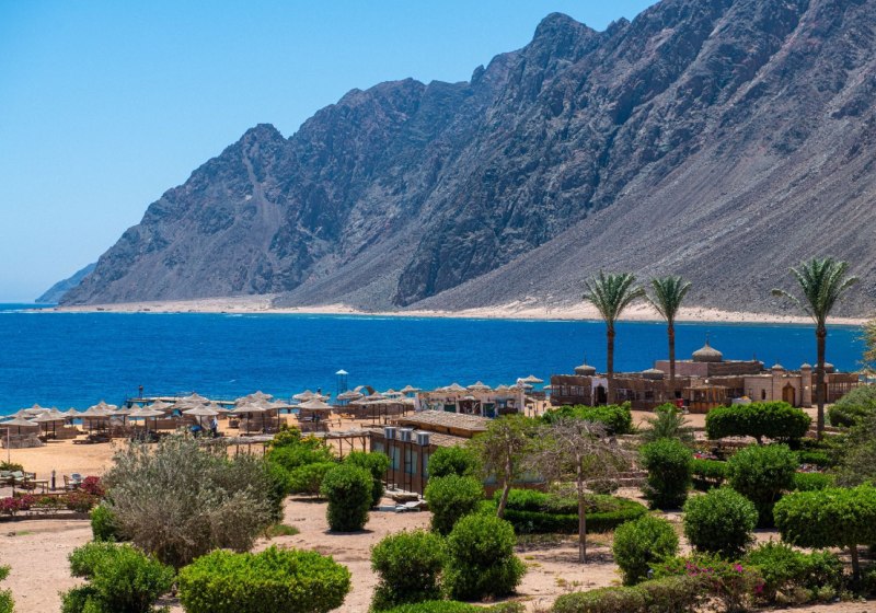 Das Happy Life Village liegt in Wady Quonay bei Dahab/Sharm El Sheikh direkt am Strand. Vor dem Hotel beginnt das Hausriff, die Korallen reichen teils bis an den Strand – der Meerzugang erfolgt bequem über einen rund 20 Meter langen Steg. Bis Dahab sind es etwa 6 Kilometer; Ihr nutzt den hoteleigenen Shuttlebus zweimal täglich. Der Flughafen Sharm El Sheikh ist rund 100 Kilometer entfernt, die Transferzeit beträgt circa 1,5 Stunden. So verbindet Ihr ruhige Strandlage mit erreichbarer Infrastruktur. Highlight: Direktlage am Strand mit Hausriff und kurzer Distanz nach Dahab.