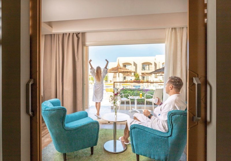 Die Zimmer ab etwa 45 m² sind mit Bad oder Dusche/WC, Föhn, Kaffee-/Teezubereiter, Klimaanlage, Telefon, Sat-TV, Minibar mit täglicher Wasserauffüllung, Safe sowie Balkon oder Terrasse ausgestattet. Das schafft verlässlichen Komfort und genügend Platz, um Aktivtage entspannt zu starten und zu beenden. Highlight: Grosse Grundrisse – ab 45 m² mit Balkon oder Terrasse.