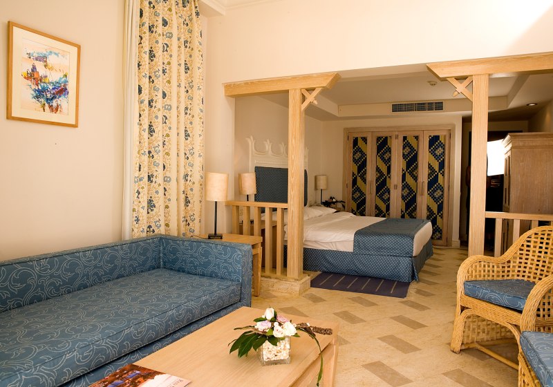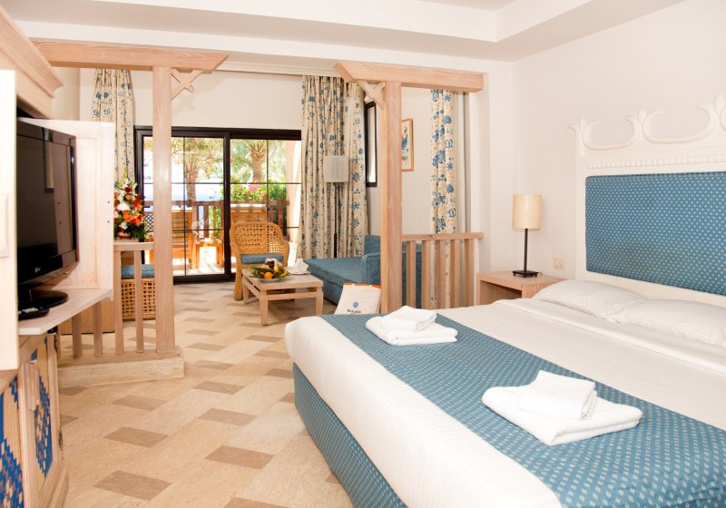 Eure Zimmer sind funktional ausgestattet: Dusche, WC, saisonale Klimaanlage, Telefon, Sat-TV, Safe, Föhn und Kühlschrank. Balkon oder Terrasse öffnen den Blick in die Anlage. Juniorsuiten bieten mehr Fläche, teils mit Sitzecke sowie Garten- oder Meerblick. Das Design folgt dem praktischen Urlaubsalltag am Meer.