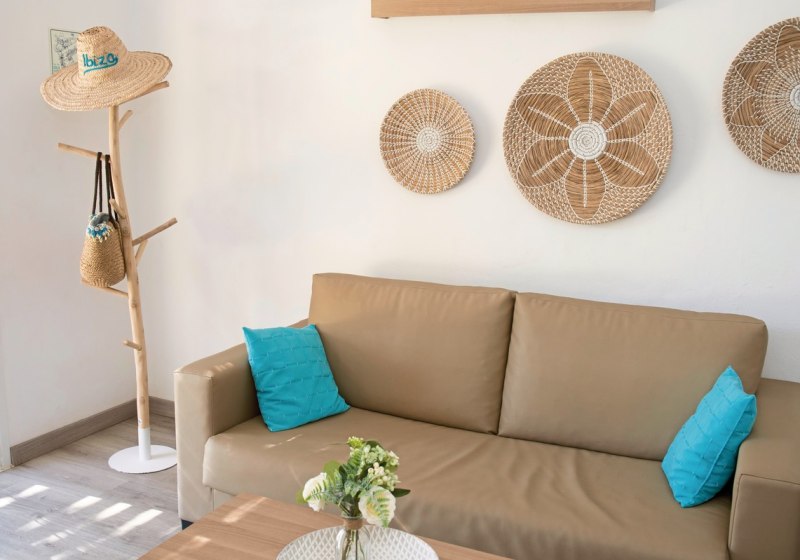 Ihr wohnt an der Nordostküste von Ibiza, mit direkter Bushaltestelle am Hotel und kurzen Wegen zu Ausflugszielen. Der Sandstrand liegt etwa 600 Meter entfernt, erreichbar über Treppen – nah genug für spontane Stunden am Meer. San Carlos erreicht Ihr nach ungefähr vier Kilometern, der Flughafen ist rund 35 Kilometer entfernt. In der Umgebung findet Ihr zudem Restaurants, Bars und Einkaufsmöglichkeiten in Laufdistanz. Die Anlage selbst öffnet sich in den Garten hinein und schafft Abstand zum Trubel, während Ihr dank Anbindung schnell unterwegs seid – ein ruhiger Ausgangspunkt für entspannte Strandtage und flexible Inselentdeckung.