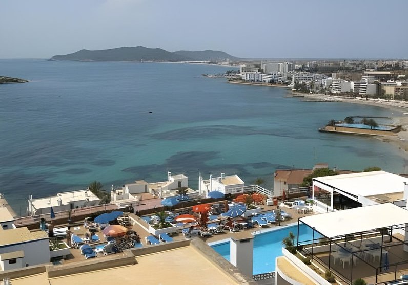 Cenit empfängt Euch im Stadtteil Figueretas von Ibiza-Stadt, erhöht gelegen mit weitem Blick aufs Meer. Die Anlage aus Haupt- und Nebengebäude wirkt kompakt und übersichtlich, mit klar strukturierten Wegen zwischen Empfangshalle, Sonnenterrasse und Poolbereich. Ihr erlebt hier ein unkompliziertes Ambiente, das Stadtnähe und Meeresnähe verbindet. Für Strandtage, Stadtbummel und abendliche Ausgänge liegt alles greifbar nah.