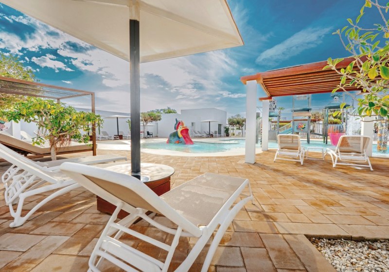 • Liegestühle • Außenpool • Sonnenschirme • Poolbar • Sonnenterrasse • Badetücher • Wasserrutsche • Pool