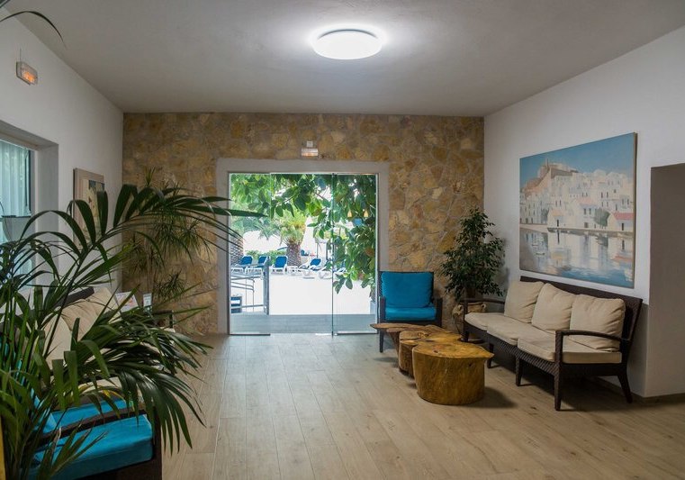 Die öffentlichen Bereiche wirken übersichtlich und zugänglich: Außenpool mit Kinderbecken, Sonnenterrassen mit Liegen und Schirmen, Gartenflächen sowie Terrassen auf allen Etagen. Der Empfang ist durchgängig besetzt; WLAN, Internetecke, Aufzug und Safe sorgen für praktische Abläufe.