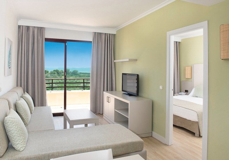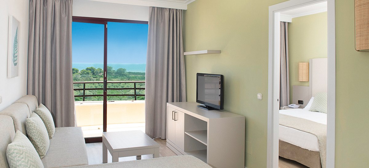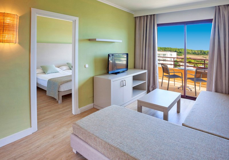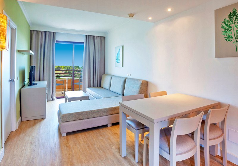 Ihr wohnt in Appartements ab etwa 40 Quadratmetern mit Wohnraum samt Schlafsofa und separatem Schlafzimmer. Zur Ausstattung zählen Klimaanlage (warm/kalt), Kühlschrank, TV, Telefon, Basis-WLAN inklusive, Mietsafe sowie Bad mit Dusche/WC und Föhn. Ein Balkon oder eine Terrasse öffnet den Blick nach draußen.