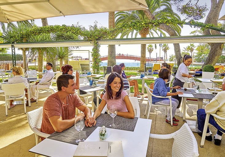 Das Restaurant mit Außenterrasse ist Euer Ankerpunkt zwischen Strand und Pool. Ihr esst à la Buffet mit Live-Kochen und wählt nach Bedarf: vegetarisch, glutenfrei oder laktosefrei, auf Wunsch auch Diätgerichte. Frühstück und Abendessen bilden den Rahmen; tagsüber greifen Snacks die leichte Linie auf. Alkoholfreie und alkoholische Getränke sind im All-inclusive-Angebot abgedeckt.