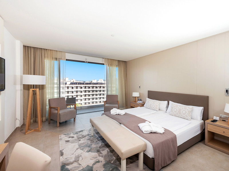 • Klimaanlage • Balkon (je nach Zimmerkategorie) • Kühlschrank • Haartrockner • Minikühlschrank • Minibar • Telefon • Safe • Meerblick (je nach Zimmerkategorie: seitlich) • Fernseher • rollstuhlgerechte Zimmer (auf Anfrage) • WiFi (kostenfrei) • Strandblick (seitlich) • Sauna (kostenfrei, Holz/Parkett, 4) • Terrasse