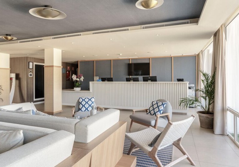 Die öffentlichen Bereiche wirken strukturiert und einladend: Lobby mit Rezeption und Lounge, Lifte, Gartenflächen und Sonnenterrassen mit Schirmen und Liegen. WLAN ist im gesamten Hotel nutzbar, Check-in ab 15 Uhr, Check-out bis 12 Uhr. Wäscherei und Zimmerservice ergänzen den Komfort.