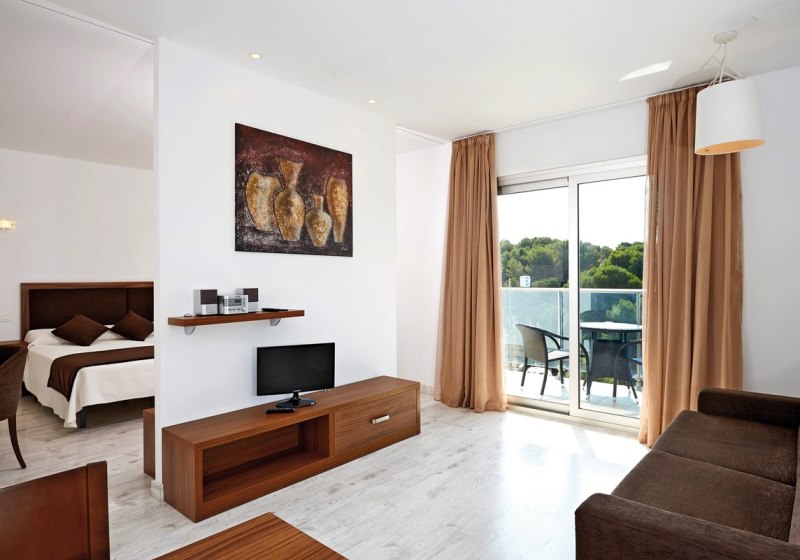 Die Apartments bieten ein bis zwei separate Schlafzimmer, dazu einen kombinierten Wohn-/Schlafraum mit Schlafsofa – ideal, wenn Ihr mit mehreren reist. Klimaanlage, Dusche, Haartrockner, Sat-TV und WLAN sind gesetzt. Der Blick variiert je nach Lage: Hafen, Meer oder Straße, dazu möblierter Balkon oder Terrasse für die private Draußenzeit.