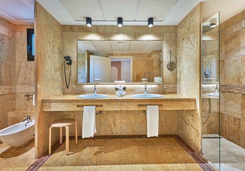 Die Juniorsuite bietet Sitzecke, Eckbadewanne, separate Multijet-Dusche, zweiten Balkon mit Meerblick und ein Balibett am Pool auf rund 71 m². Die Imperial Suite (ca. 110 m²) ergänzt ein Marmorbad mit Whirlpool, Kopfkissenmenü und Sonnenliegen auf dem Balkon. Highlight: Suiten mit Badefokus und klaren Mehrwerten für lange Abende.