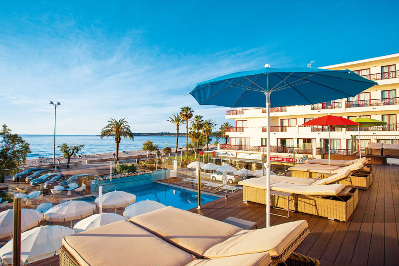 Die Infrastruktur ist klar und praxisnah. Rezeption, zwei Lifte und Aufenthaltsräume strukturieren die Gemeinschaftsbereiche. Draußen erwarten Euch zwei Süßwasser-Außenpools, eine Sonnenterrasse mit Liegen und Schirmen sowie ein separates Kinderbecken. Der direkte Zugang über die Promenade macht den Wechsel zwischen Pool und Strand besonders bequem.