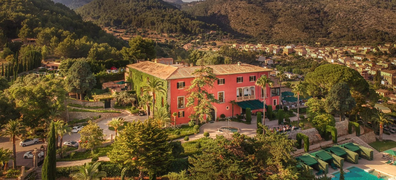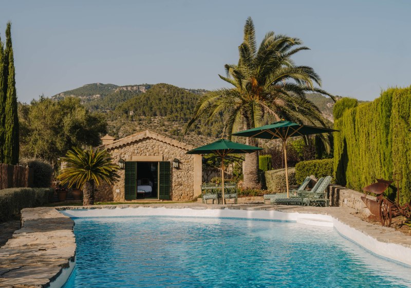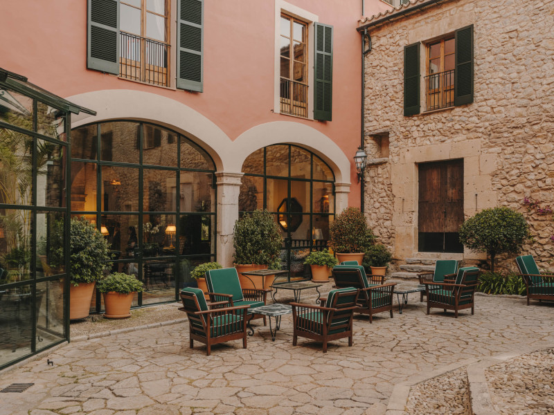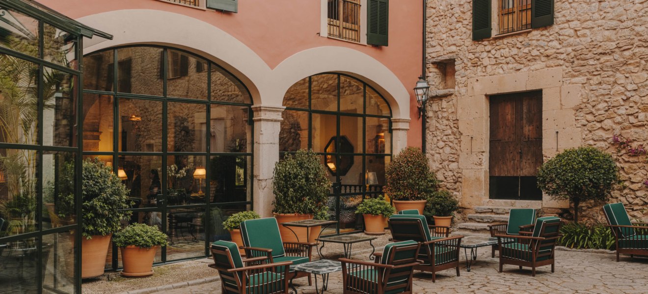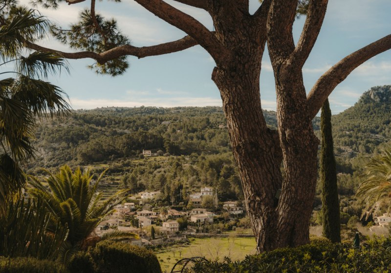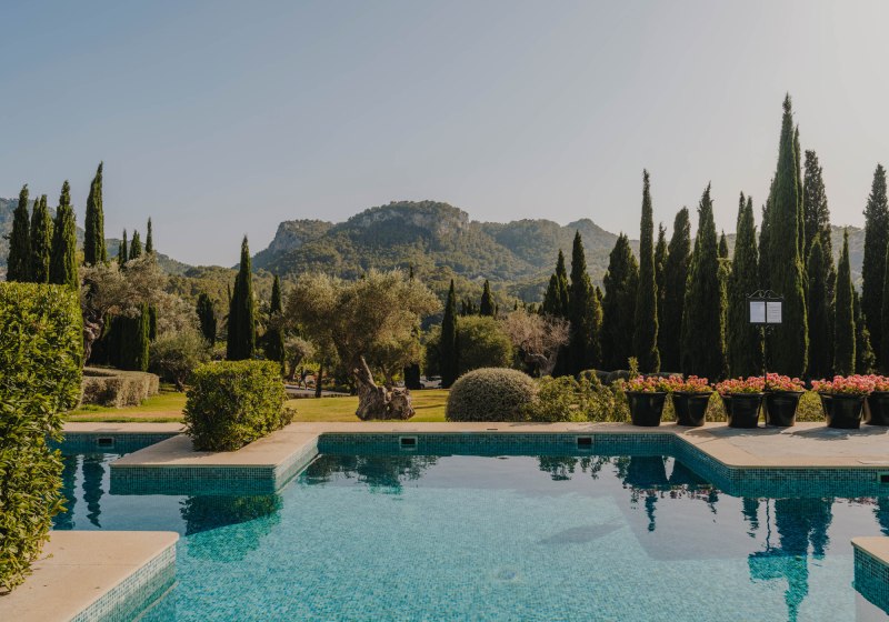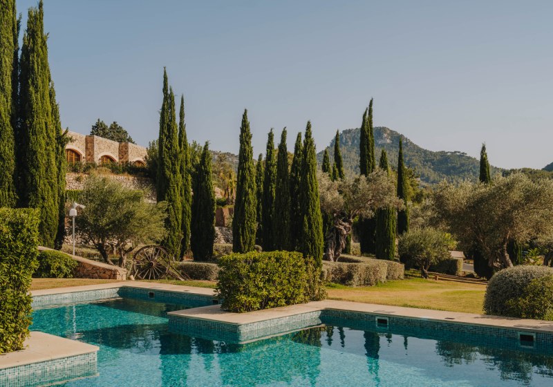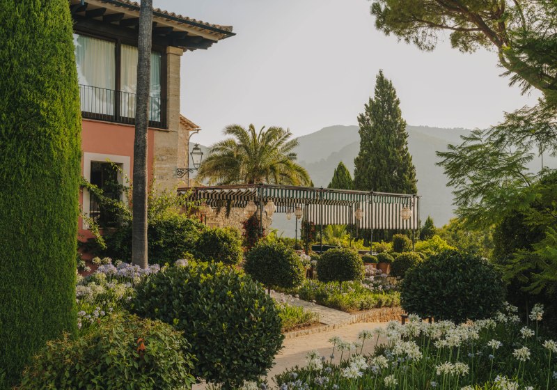 Das Ensemble aus historischen Mauern, Innenhof und Gärten bindet sich in die Umgebung ein. Wege führen über Terrassen und unter Bäumen entlang, stets mit einem Blick, der zwischen Himmel und Tramuntana wechselt. Der private Weinberg verankert das Haus zusätzlich im Ort und setzt einen klaren Akzent, der die Identität des Ziels prägt.