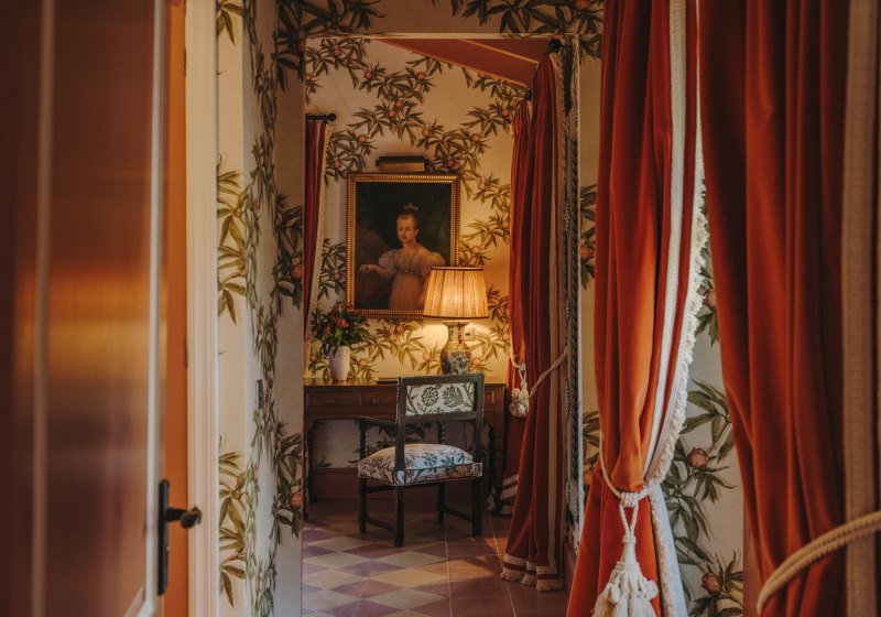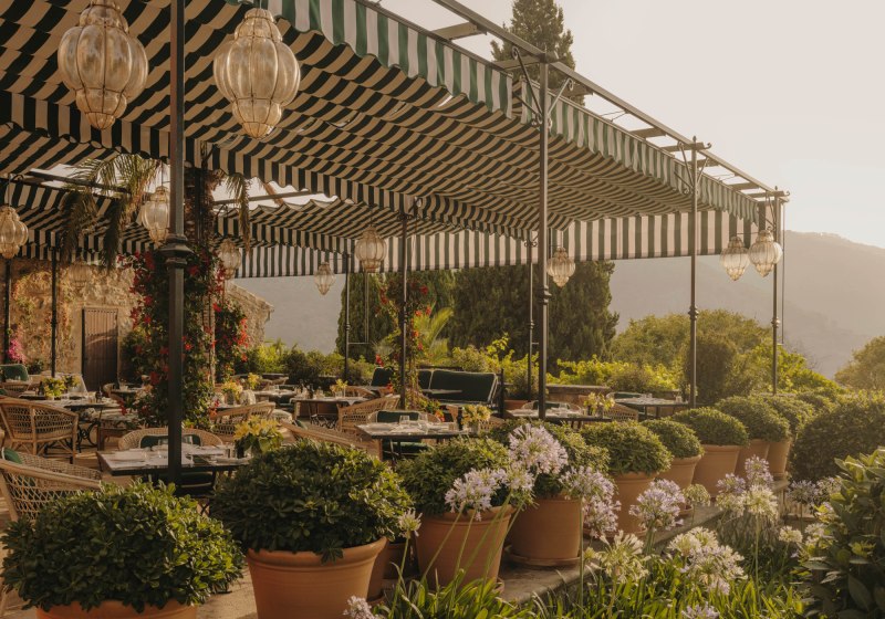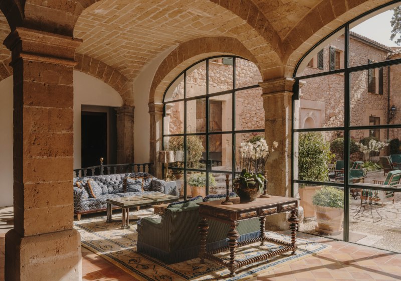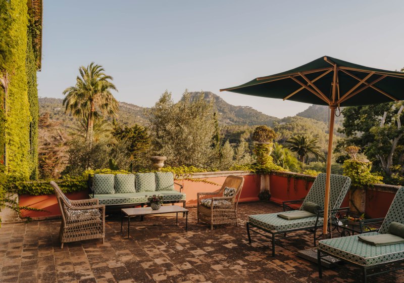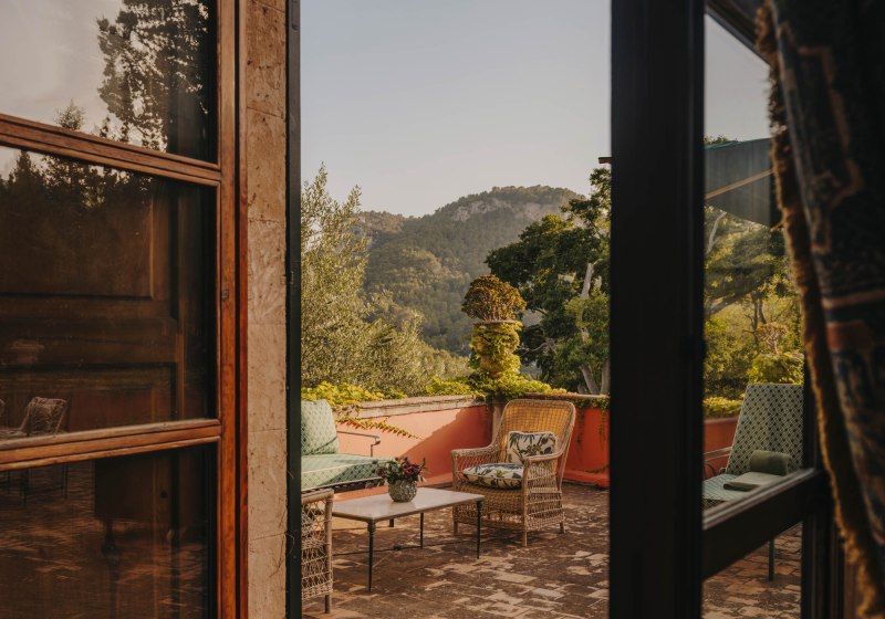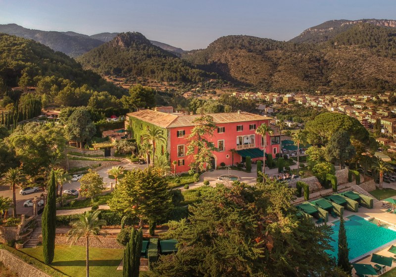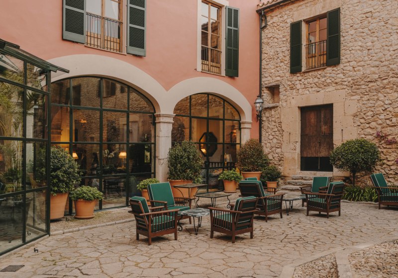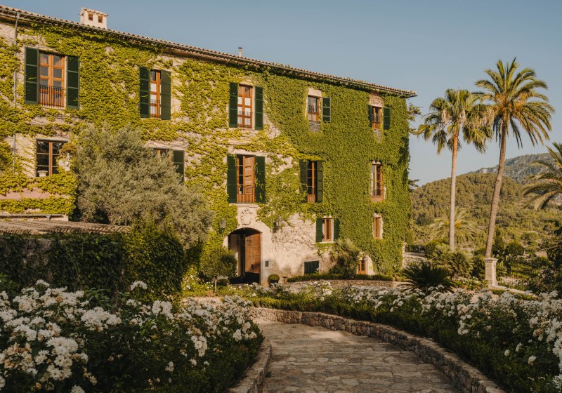 Das Ensemble aus historischen Mauern, Innenhof und Gärten bindet sich in die Umgebung ein. Wege führen über Terrassen und unter Bäumen entlang, stets mit einem Blick, der zwischen Himmel und Tramuntana wechselt. Der private Weinberg verankert das Haus zusätzlich im Ort und setzt einen klaren Akzent, der die Identität des Ziels prägt.