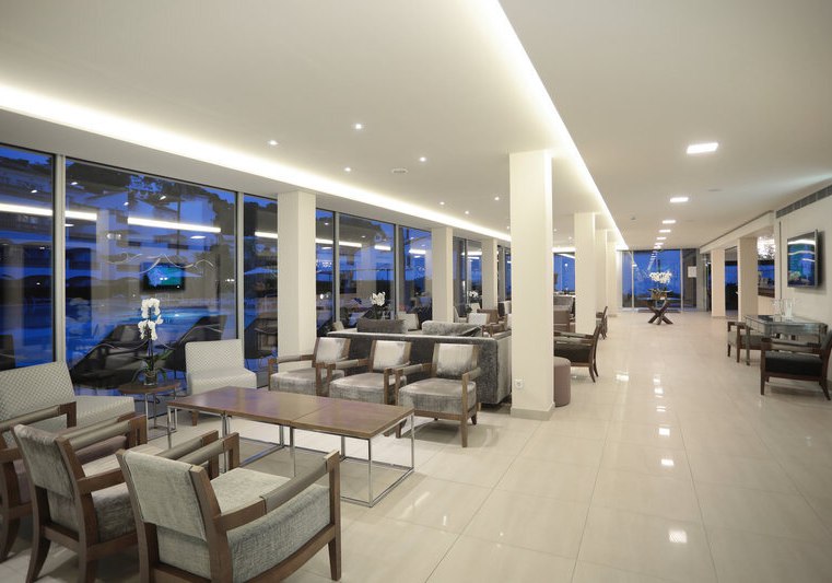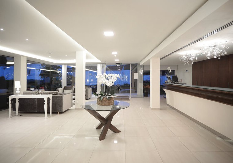 Die Anlage wirkt aufgeräumt und großzügig: Rezeption, Aufenthalts- und TV-Raum, Bibliothek sowie eine weitläufige Sonnenterrasse mit Liegen und Schirmen bilden den Rahmen. WLAN steht im gesamten Hotel zur Verfügung. Badetücher erhaltet Ihr gegen Kaution.
