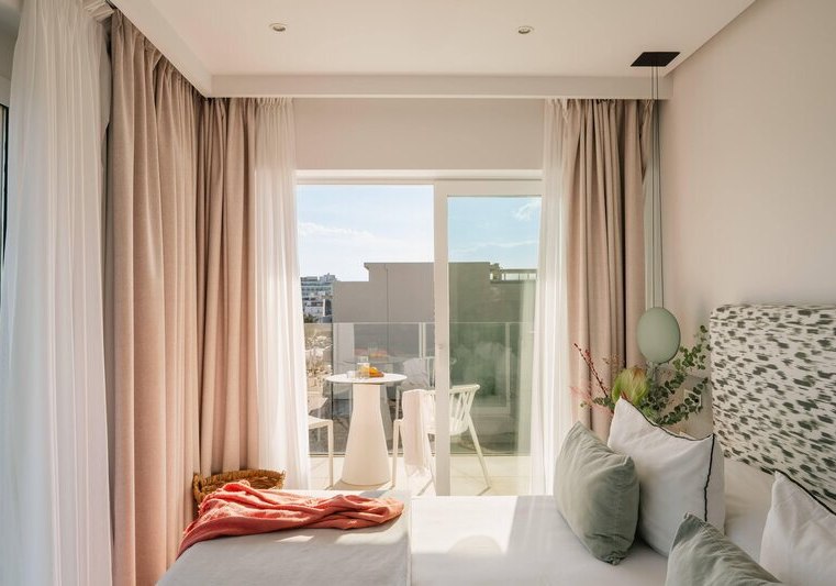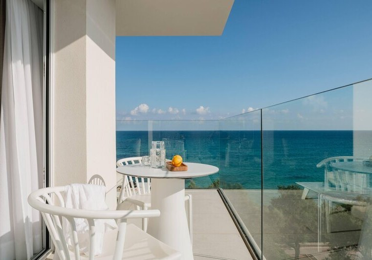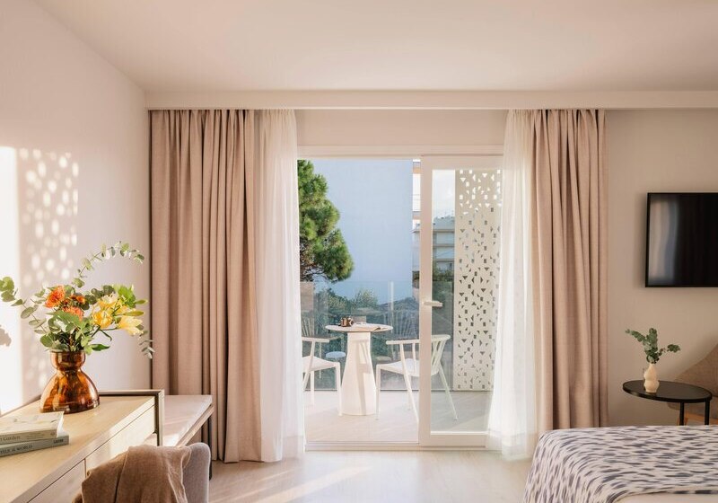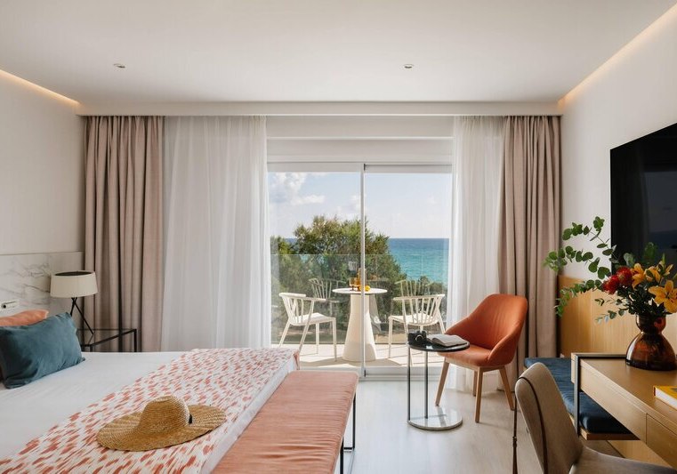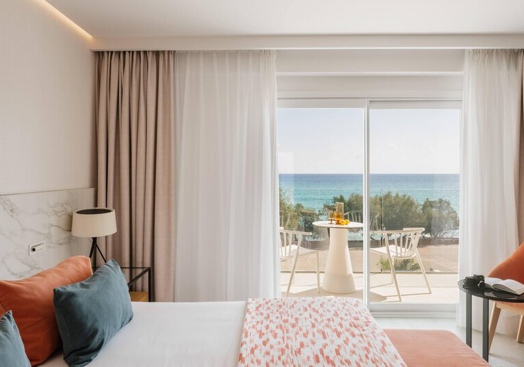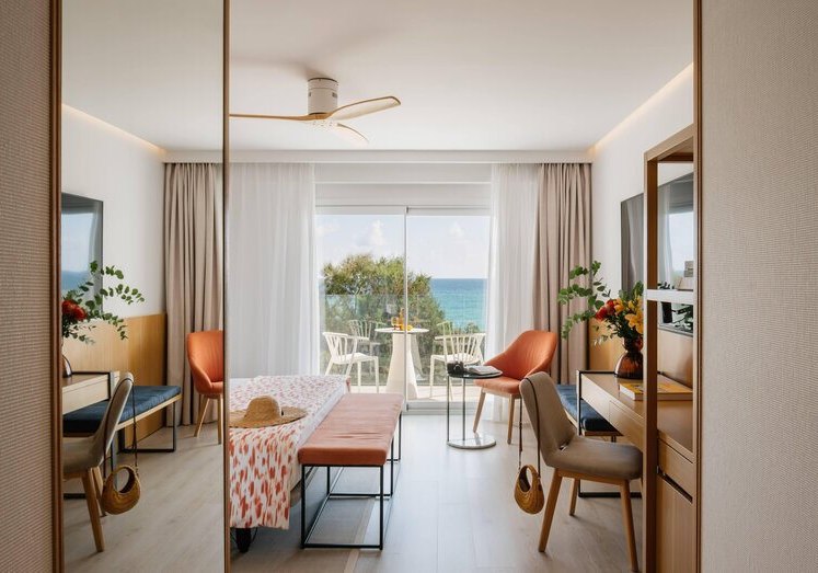 Die 98 Zimmer sind klar ausgestattet: Klimaanlage, TV, Safe, Minibar sowie Bad oder Dusche mit Föhn. Je nach Kategorie wohnt Ihr mit Balkon oder Terrasse; Einzelzimmer sind auch ohne Balkon verfügbar. Für den Blick wählt Ihr seitlichen Meerblick oder direktes Meerpanorama.