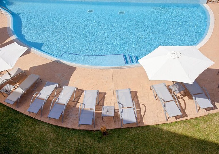 • Poolzeit: Außenpool mit Kinderbecken, Liegen, Schirmen und Badetüchern.