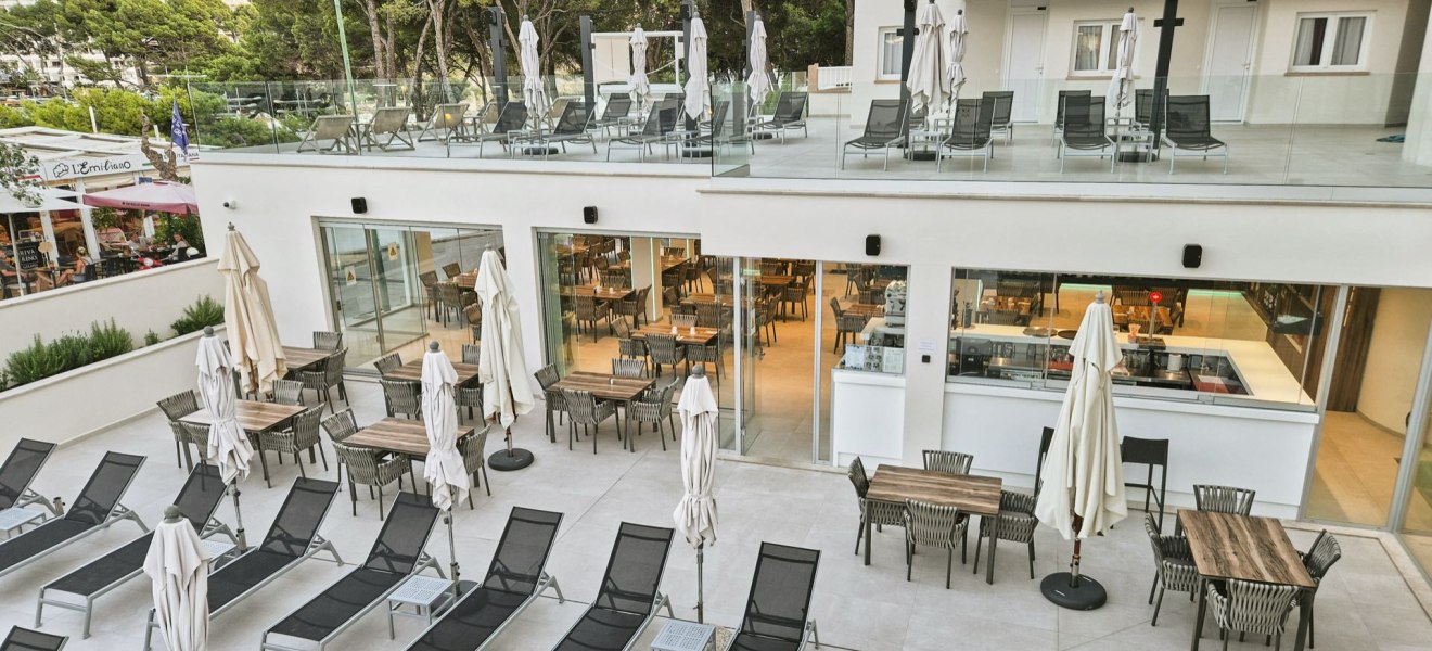 - Zwei Ebenen: Sonnenterrassen auf zwei Höhenlagen mit Liegen und Schirmen.