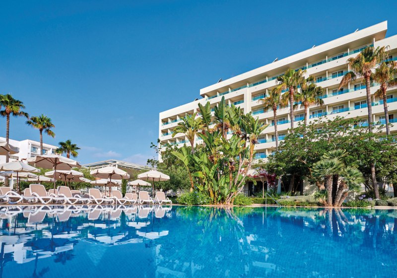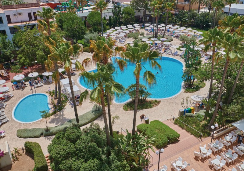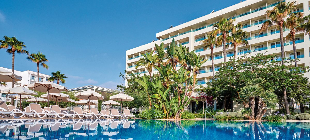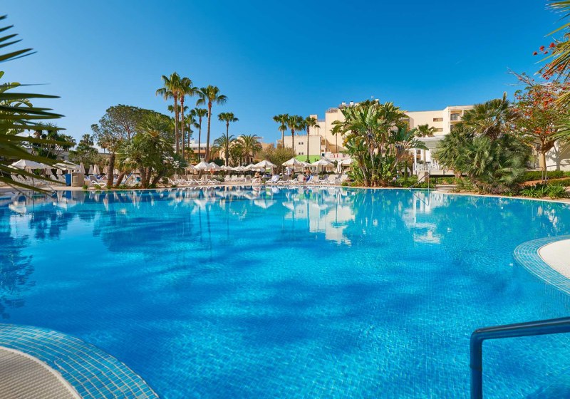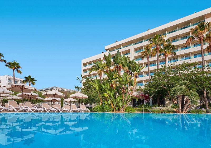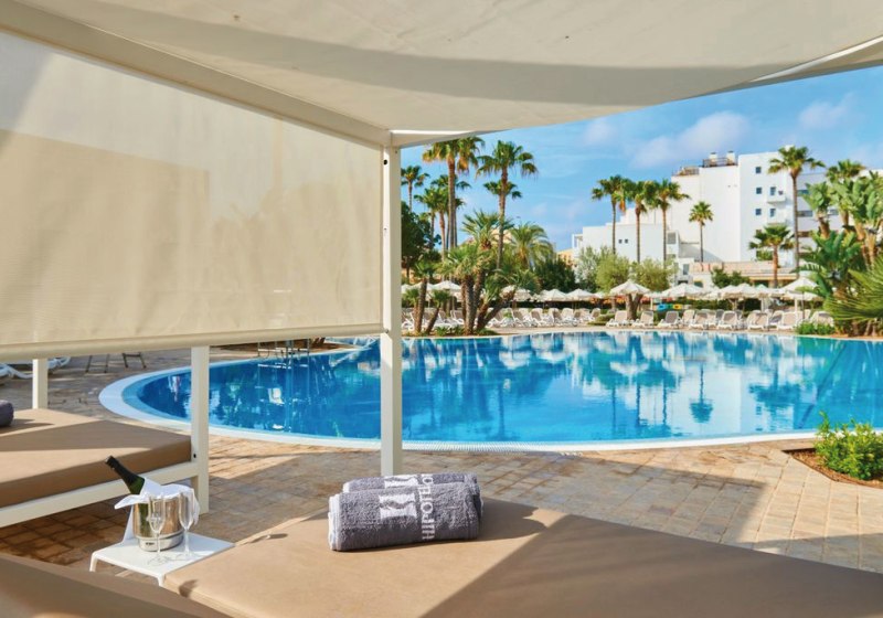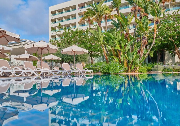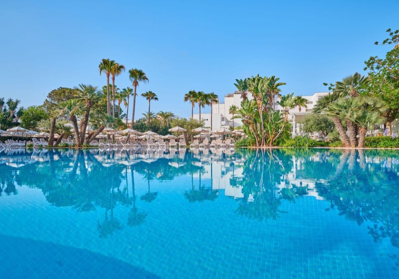 Die Infrastruktur ist umfassend und klar strukturiert: Lobby mit 24-Stunden-Rezeption, zwei Aufzüge, kostenloses WLAN im ganzen Haus. Draußen breitet sich die 323 m² große Poollandschaft mit Sonnenterrasse aus; Liegen und Schirme stehen bereit, Badetücher sind verfügbar. Für Kinder gibt es einen eigenen Pool und einen Spielplatz. Ergänzend: Konferenzraum, Tour-Desk, Mietwagen- und Fahrradverleih, Wechselstube, medizinische Betreuung sowie Wäsche- und Trockenreinigungsservice. Highlight: Großzügige Poolzone mit klaren Wegen und viel Tageslicht.