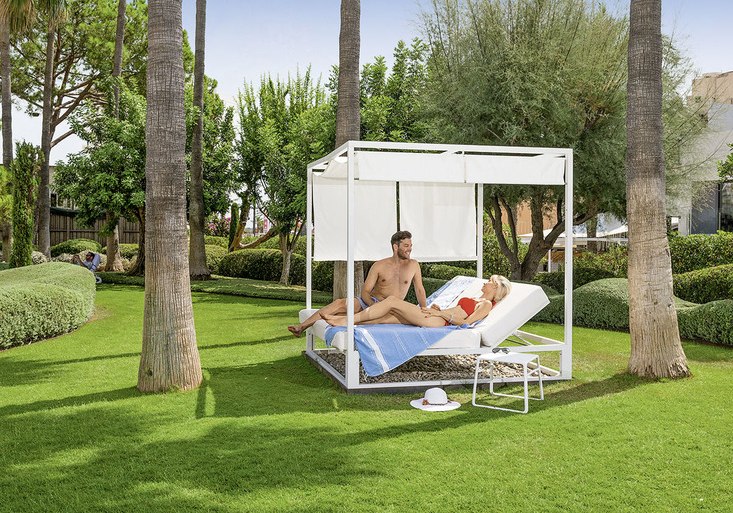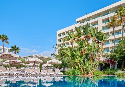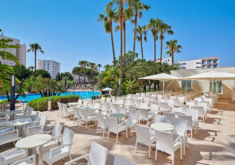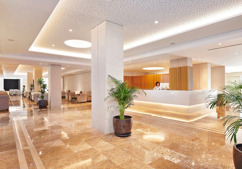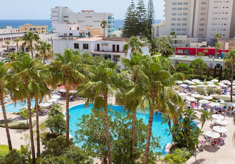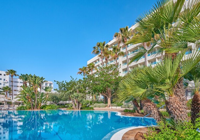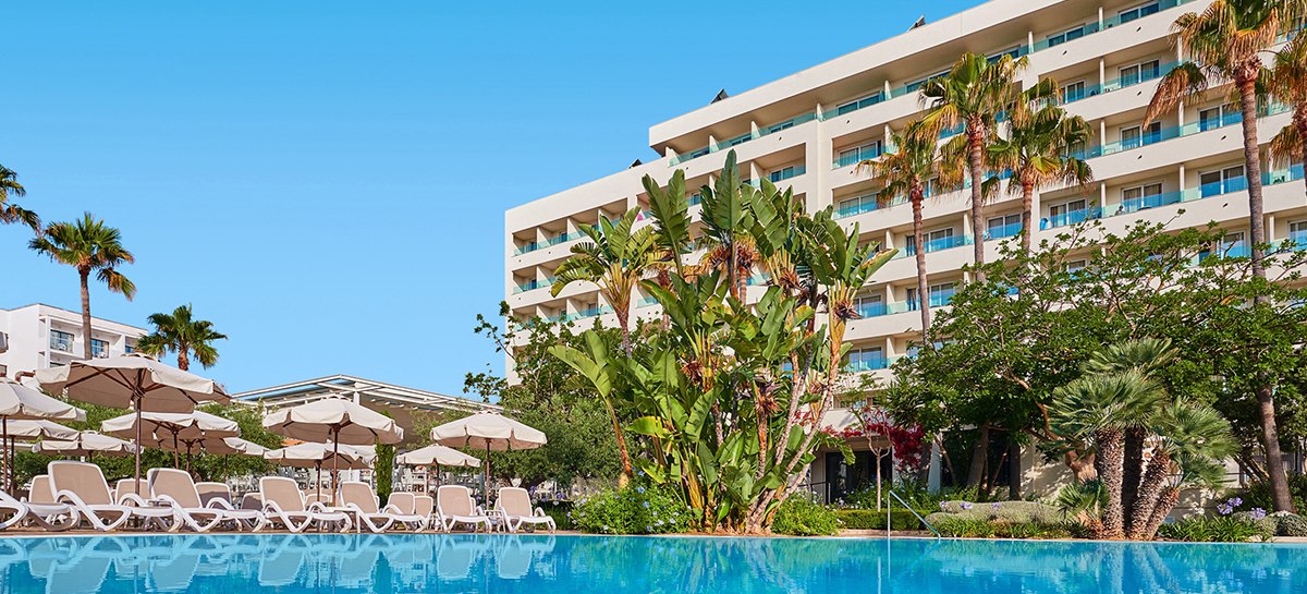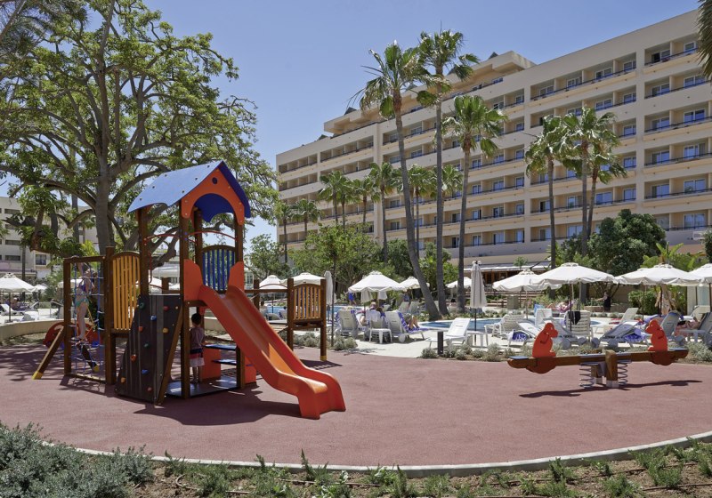 Die Infrastruktur ist umfassend und klar strukturiert: Lobby mit 24-Stunden-Rezeption, zwei Aufzüge, kostenloses WLAN im ganzen Haus. Draußen breitet sich die 323 m² große Poollandschaft mit Sonnenterrasse aus; Liegen und Schirme stehen bereit, Badetücher sind verfügbar. Für Kinder gibt es einen eigenen Pool und einen Spielplatz. Ergänzend: Konferenzraum, Tour-Desk, Mietwagen- und Fahrradverleih, Wechselstube, medizinische Betreuung sowie Wäsche- und Trockenreinigungsservice. Highlight: Großzügige Poolzone mit klaren Wegen und viel Tageslicht.