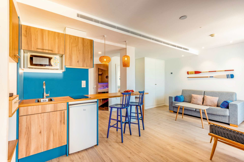 Die gemütlichen, komfortablen, mediterranen und modernen Apartments verfügen über ein Schlafzimmer und ein Wohnzimmer mit Verbindungstür, eine Kitchenette und eine Terrasse. Sie sind außerdem mit einer Dusche/WC, Essecke, Kaffeemaschine, Mikrowelle, Minikühlschrank, Sitzecke, TV und Telefon ausgestattet. WLAN ist inklusive und es gibt optional einen Safe gegen Gebühr sowie eine Klimaanlage.