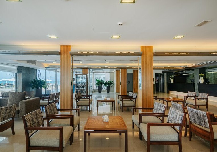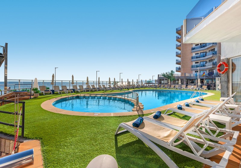 Ihr nutzt Liegestühle und Sonnenschirme am Pool-Bereich des Nachbarkomplexes; ein Kinderpool ist ausgewiesen. Auf der Promenadenseite genießt Ihr die unmittelbare Strandnähe, ohne auf die Infrastruktur zu verzichten. So wirkt das Haus kompakt und zweckmäßig – mit kurzen Wegen zwischen Strand, Lobby, Bar und Restaurant.