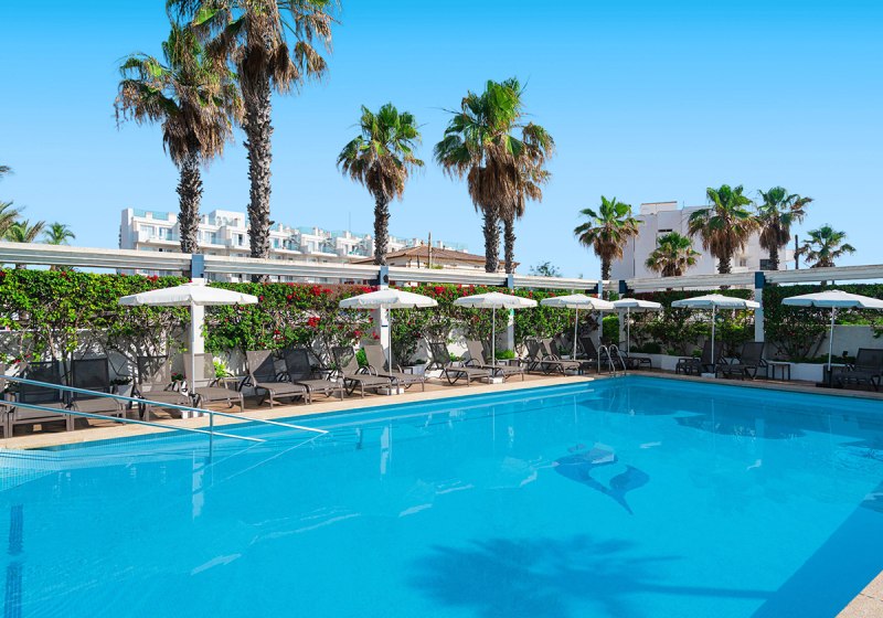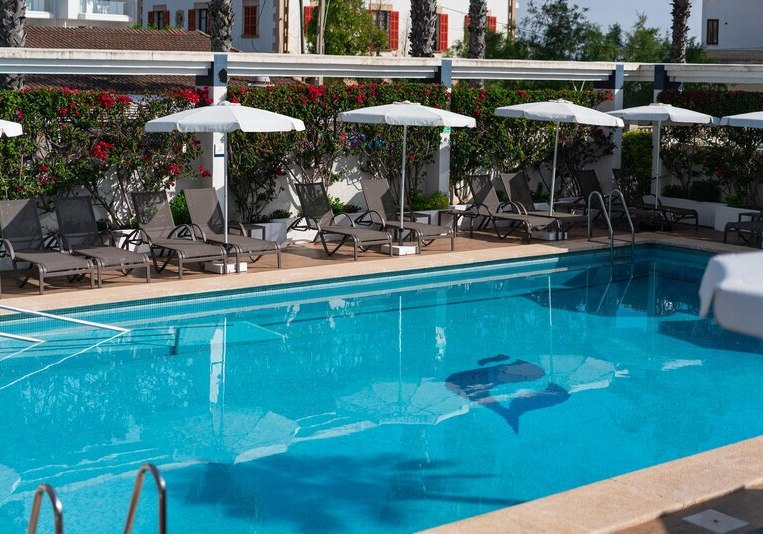 Das Haus bietet 177 Zimmer auf vier Etagen, zwei Lifte, eine 24-Stunden-Rezeption und kostenfreies WLAN im gesamten Hotel. Im Empfangsbereich und TV-Raum wirkt alles aufgeräumt und klar strukturiert. Draußen wartet der Pool mit Liegen und Sonnenschirmen; Badetücher erhaltet Ihr gegen Kaution. Check-in ist ab 14 Uhr, Check-out bis 12 Uhr.