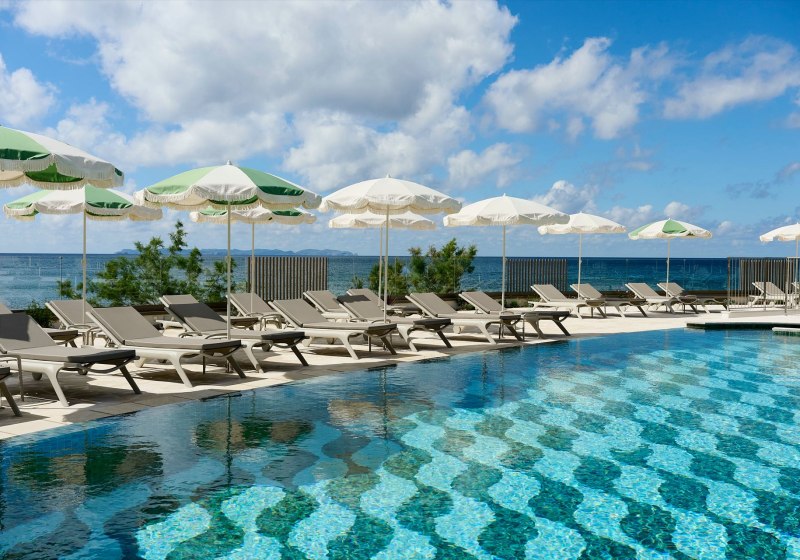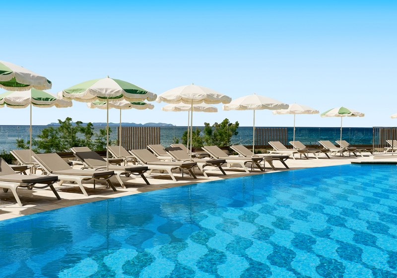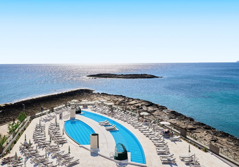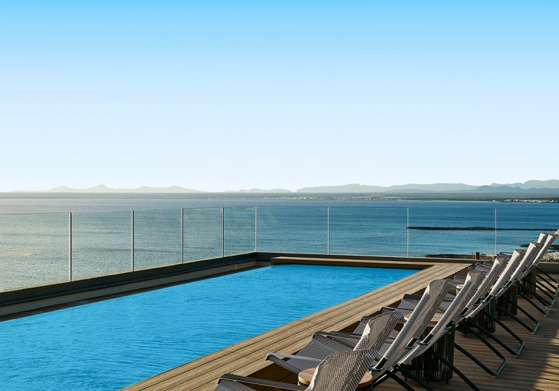 - Pools mit Blick: Außenpool unten und Dachterrassenpool bieten klare Meerperspektiven.