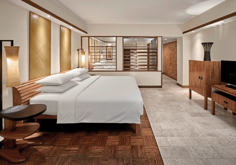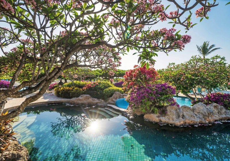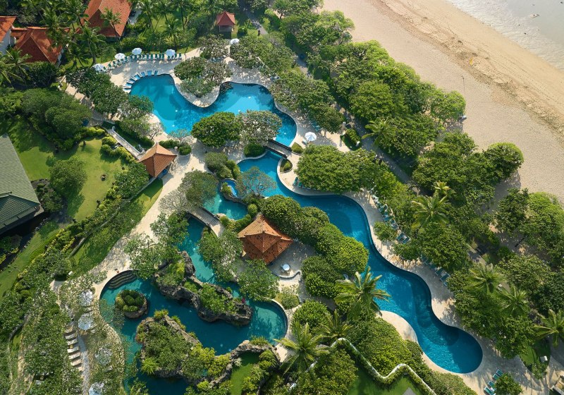 Im Grand Hyatt Bali wohnt Ihr direkt am Sandstrand von Nusa Dua und bewegt Euch zwischen üppigen Gärten, Lagunen und Wasserflächen. Fünf weitläufig gestaltete Pools mit Lagunenabschnitten, Wasserrutschen und Wasserfällen strukturieren die Anlage und geben Eurem Tag einen klaren Rhythmus zwischen Meer, Badesteg und schattigen Rückzugsorten. Das Ambiente wirkt weitläufig und sorgfältig gepflegt, mit dezenten Servicewegen und ruhigen Sitzbereichen.