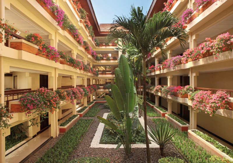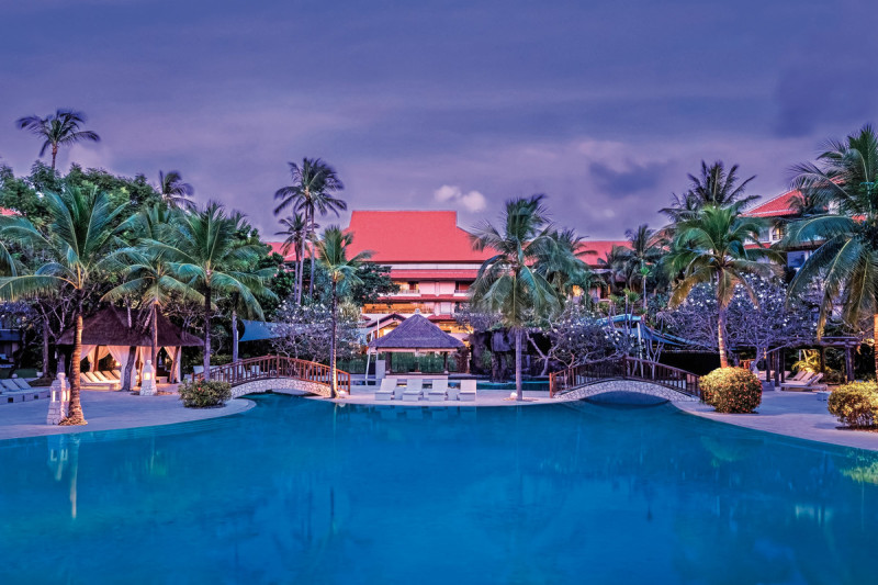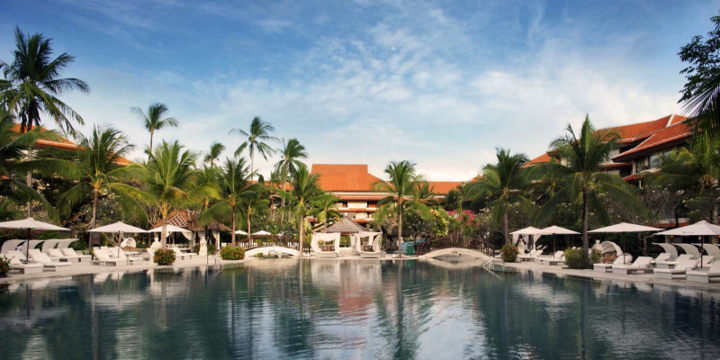 Das Resort ist an das Internationale Kongresszentrum Nusa Dua angeschlossen und eignet sich damit auch für Business-Reisen mit Erholungsfaktor im Urlaub. Fünf Restaurants, Bars und ein Poolbereich mit Meerwasser- und Kinderpool setzen den Rahmen. Highlight: Direkte Strandlage mit Kongresszentrum – Freizeit und Business nebeneinander.