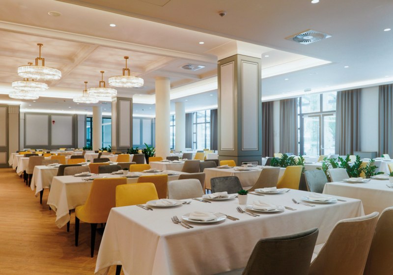 Im Restaurant erwartet Euch ein klar strukturiertes Angebot mit Frühstück und Abendessen, auf Wunsch als Halbpension, ergänzt durch Snacks und Live-Kochen. Alkoholische und alkoholfreie Getränke begleiten die Mahlzeiten. Diätgerichte, vegetarische Kost und spezielle Angebote erweitern die Auswahl, sodass Ihr flexibel bleibt. Highlight: Live-Kochen bringt frische Akzente ins Buffet.