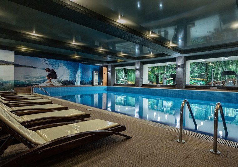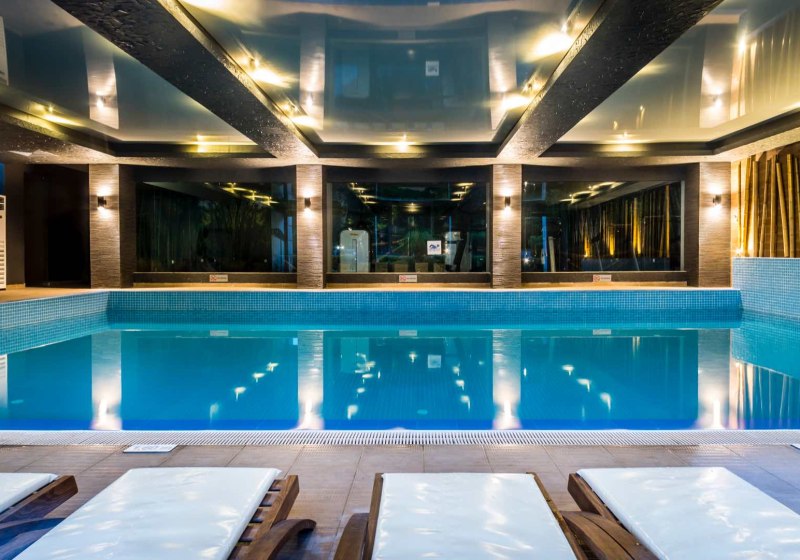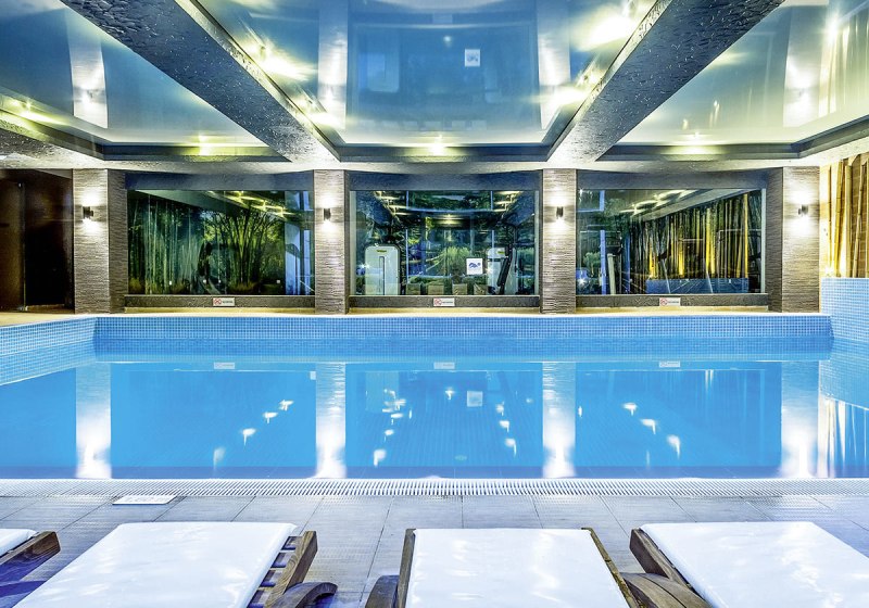 • Liegestühle • Hallenbad • Außenpool • Sonnenschirme • Poolbar • Sonnenterrasse • Wasserrutsche • Wasserpark • Pool