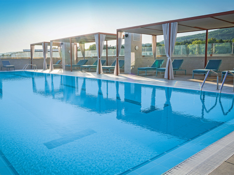 - Poolkomfort: Außen- und Innenbereiche mit Liegen, Schirmen und Poolbar.