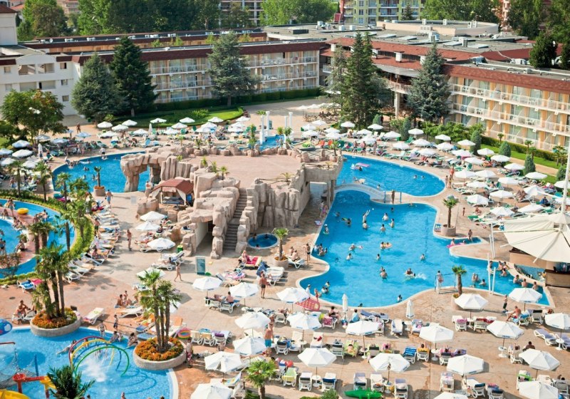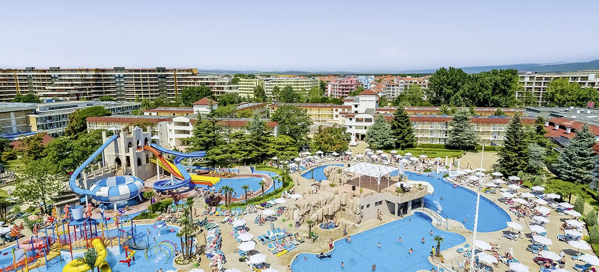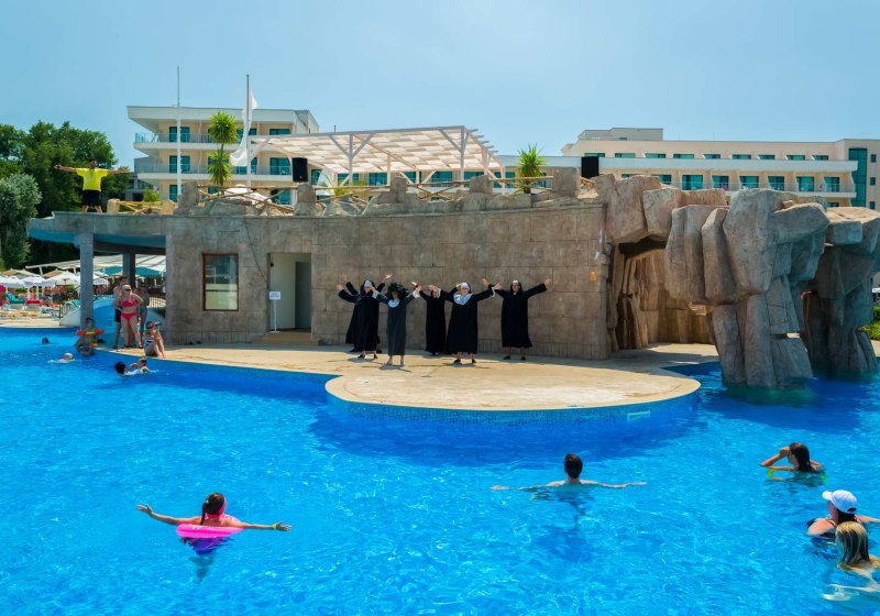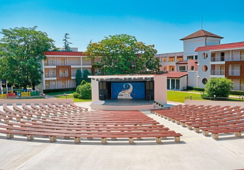 Im DIT Evrika Beach Club Hotel wohnt Ihr direkt an der lebendigen Strandpromenade des nördlichen Sonnenstrands – mit direktem Strandzugang und hauseigenem Aquapark. Die Anlage ist weitläufig, mit klar strukturierten Bereichen für Baden, Sport und Bühne. Familien und Strandurlauber finden hier Raum und Programm vom frühen Morgen bis in den Abend. Offiziell mit 4 Kategorien bewertet, wirkt das Haus unkompliziert, funktional und auf Aktivität ausgerichtet. Ihr bewegt Euch zwischen Pools, Gartenbereichen und Amphitheater, die Wege sind kurz, die Orientierung leicht.