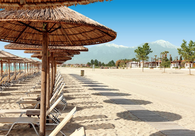 Ihr residiert direkt am flach abfallenden Sandstrand von Paralia Katerini, mit freiem Blick zum Olymp und in ruhiger, ländlicher Randlage. Der Strand liegt etwa 20 Meter entfernt, Liegen und Schirme stehen bereit. Bis ins Zentrum von Paralia sind es rund 1,5 Kilometer, nach Korinos etwa 3 Kilometer; Restaurants, Bars und ein Club liegen circa 800 Meter entfernt.