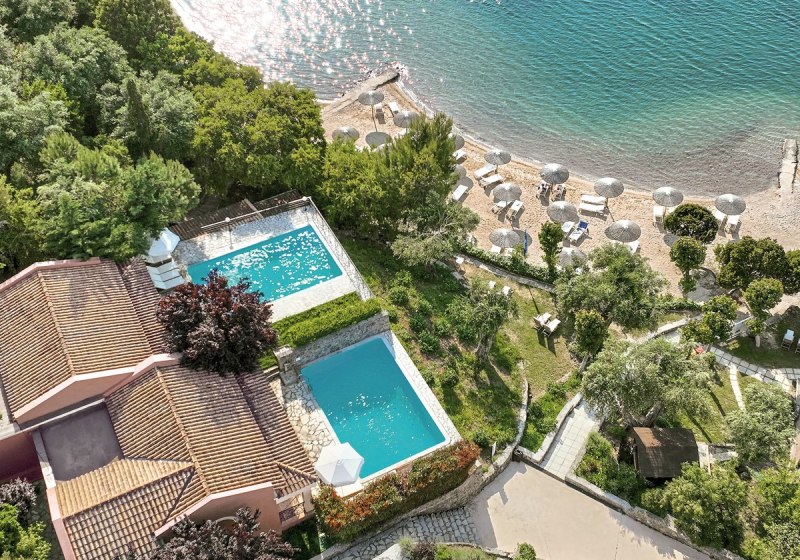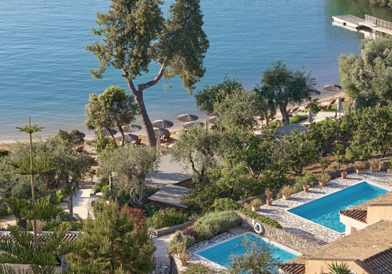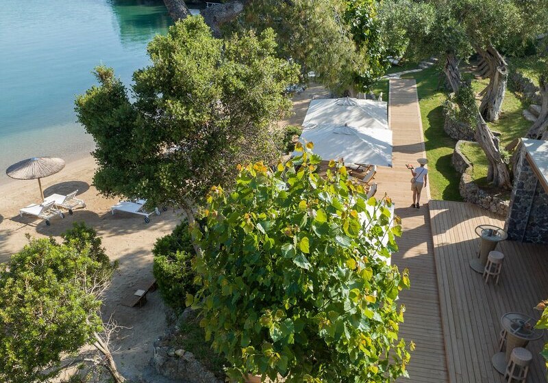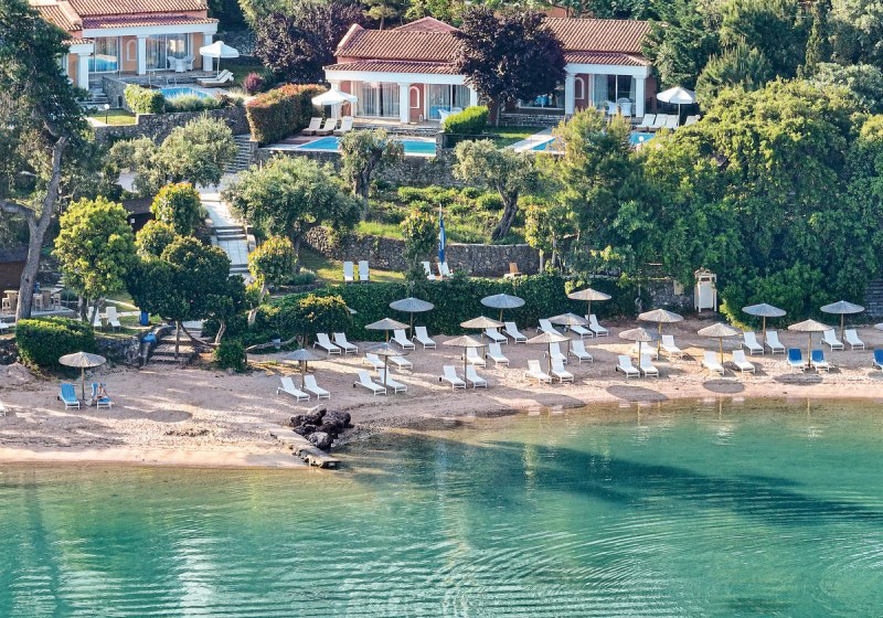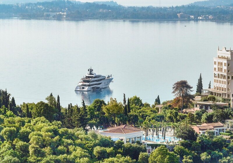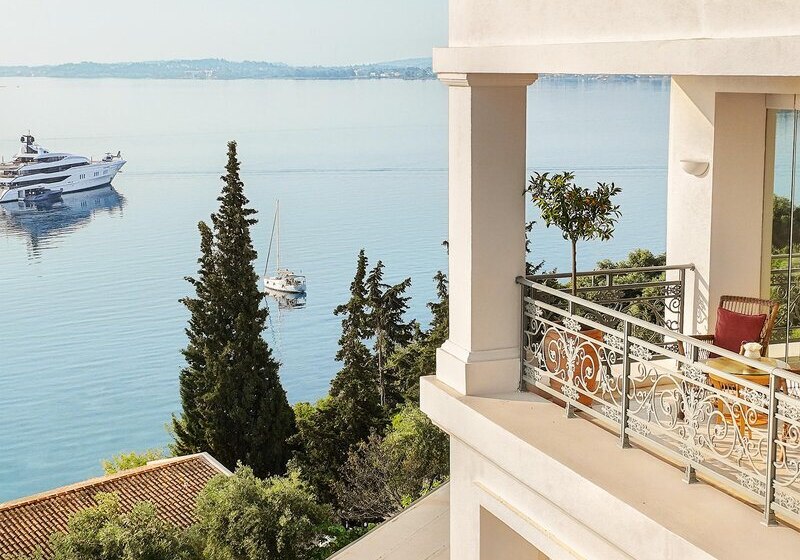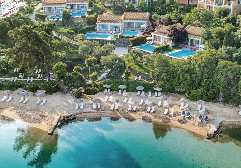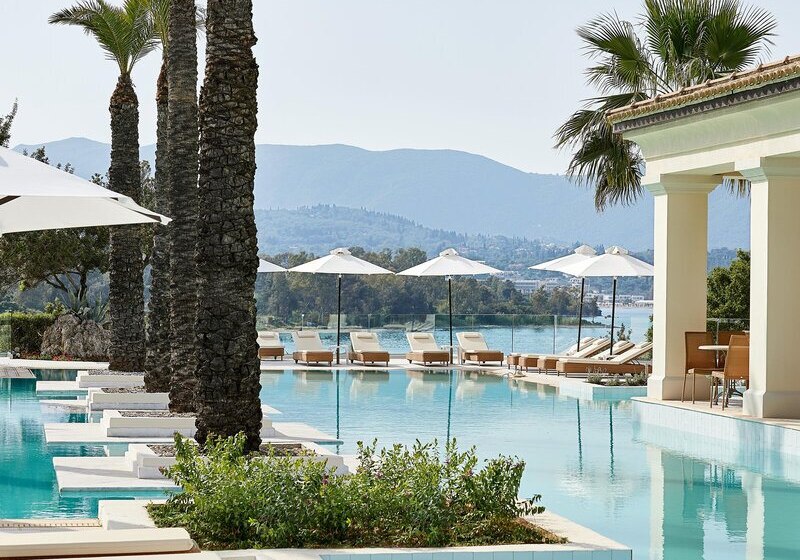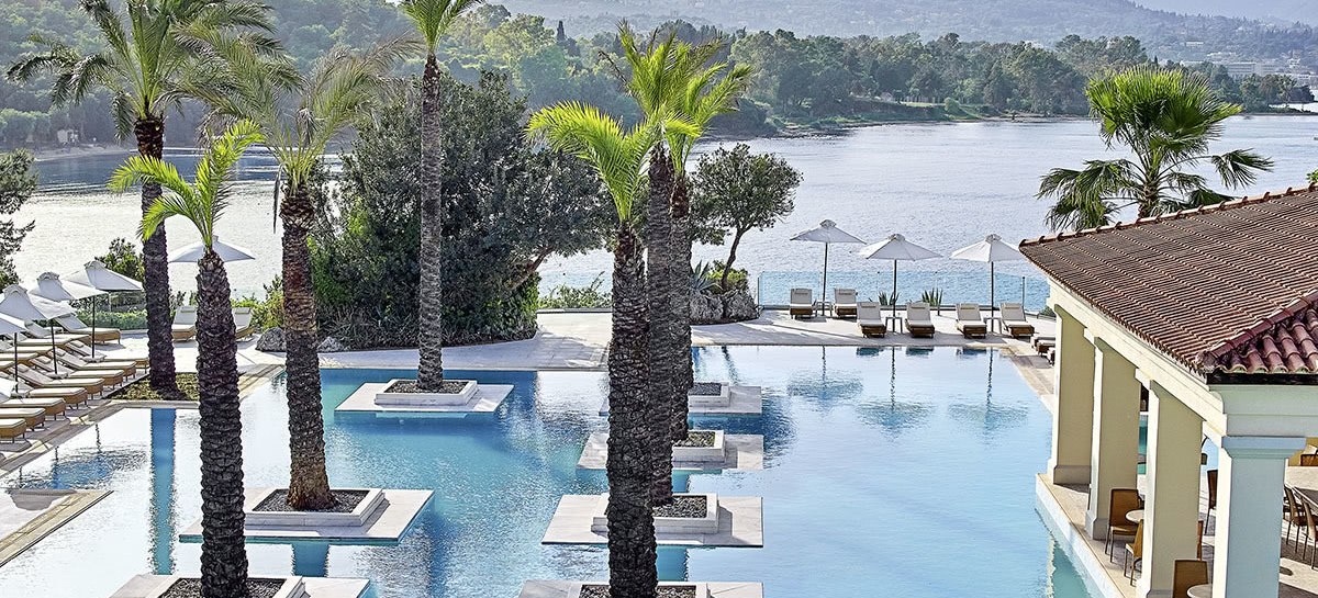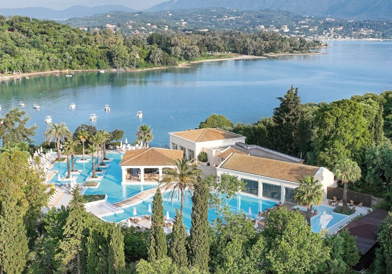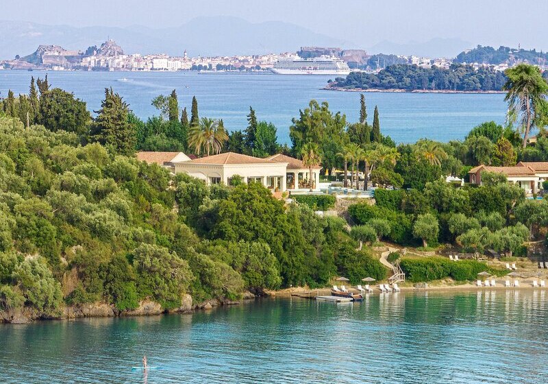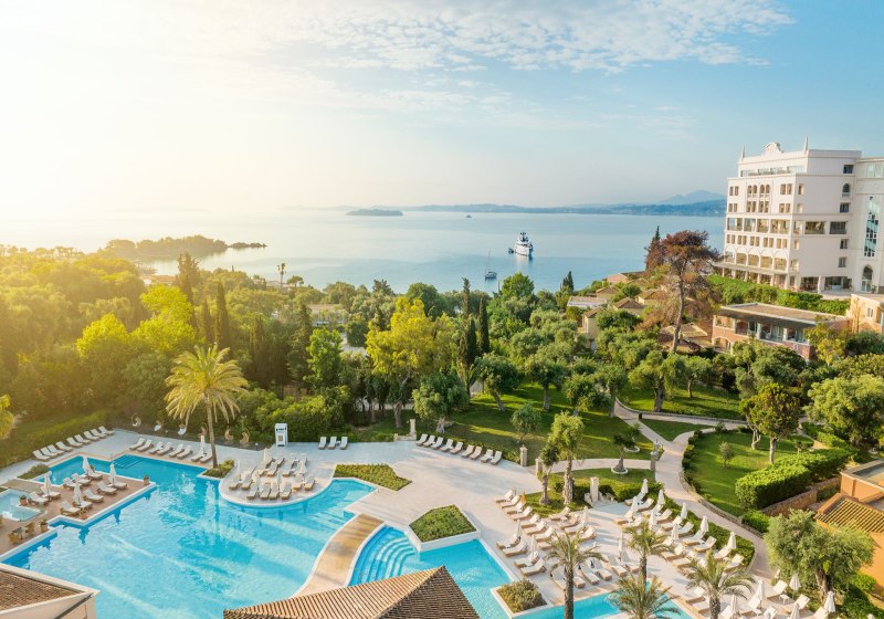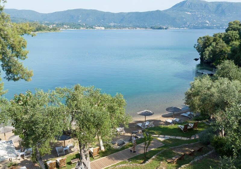 Auf der Kommeno-Halbinsel erwartet Euch Grecotel Eva Palace in einer ruhigen Badebucht mit Sand- und Kiesstrand, über Stufen erreichbar und mit Blick auf Korfu-Stadt sowie das Festland. Die Anlage verbindet großzügige Außenbereiche mit entspannter Atmosphäre – ideal für Strandreisende und Familien, die klare Struktur und verlässliche Services schätzen.