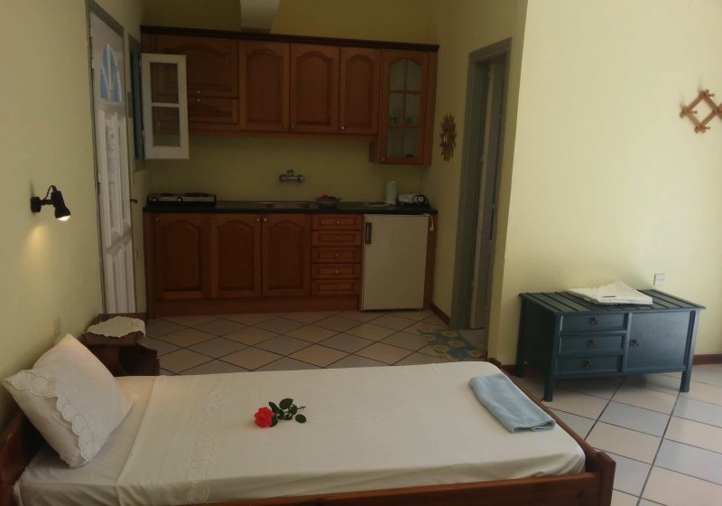 Die Studios bieten Bad oder Dusche/WC, Sat-TV, eine Klimaanlage (gegen Gebühr), Kitchenette mit Kühlschrank sowie Kaffee- und Teezubereiter. Auf Balkon oder Terrasse blickt Ihr in den Garten. Das Setting ist auf Selbstversorgung und praktische Abläufe ausgelegt, mit klaren Flächen und sinnvoller Ausstattung.